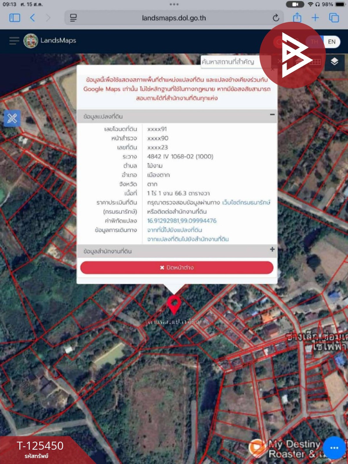 Land : Mai Ngam Tak Location : Soi Ban Trakul Kham, Mai Ngam Road, Village No. 1, Soi 9, Mai Ngam Subdistrict, Mueang Tak District, Tak Province Property code : T-125450 Type : Land Area : 1 rai 1 nga