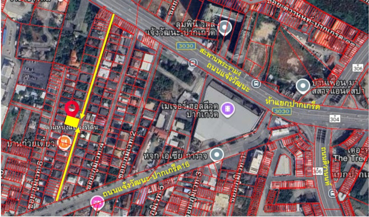 * Land for sale 108 sq m., width 18.5 meters, depth 24 meters * Entrance-exit 2 ways: Soi Chaengwattana-Pak Kret 10. (next to Chaengwattana Road) and Soi Phumvet 6 (next to Chaengwattana-Pak Kret Road 16) * Prime location in the heart of the Pak Kret community * Suitable for building a house / home office / investment Highlight * Next to the main Chaengwattana Road. There are 2 ways to enter and exit * Convenient travel on every route. Wide alley road with 2 lanes of traffic, close to Pak Kret BTS Station, there are buses passing by * The land is next to a community area, job source, commercial area, department store, market, movie theater * Ready investment potential. Fully comfortable facilities Nearby places * Pak Kret Intersection * Major Hollywood Pak Kret * Vibharam Pak Kret Hospital * Phichai Market Pak Kret * Lotus Pak Kret * Central Chaengwattana * Muang Thong Thani