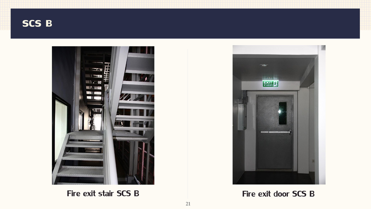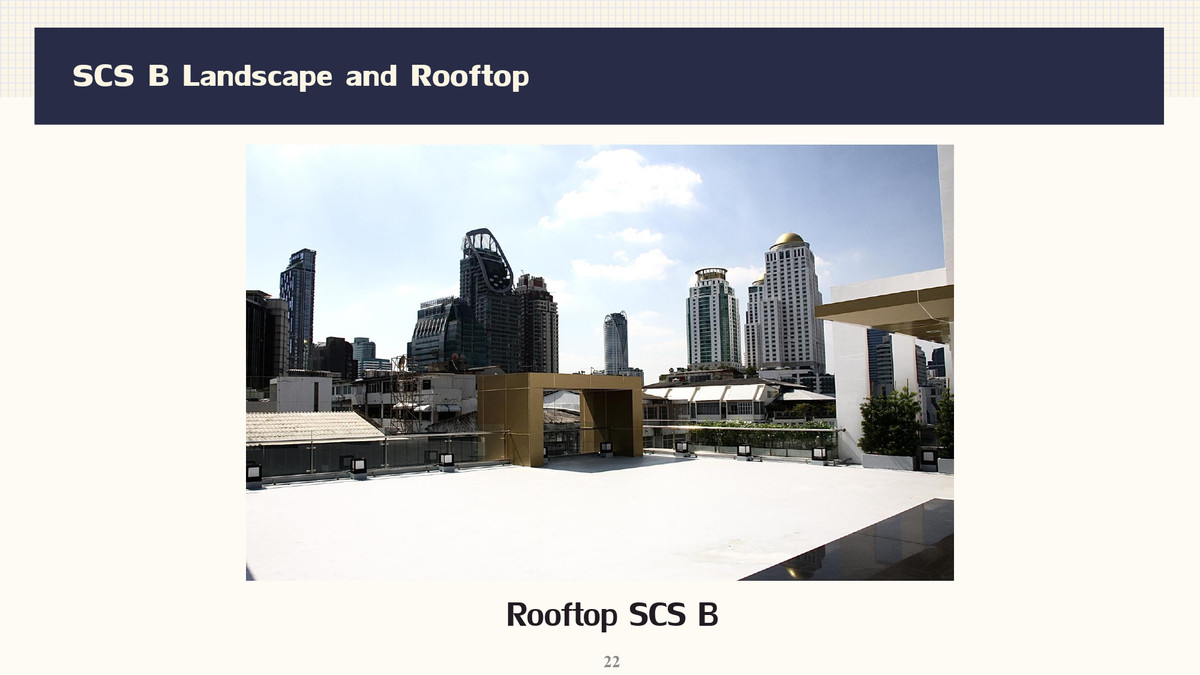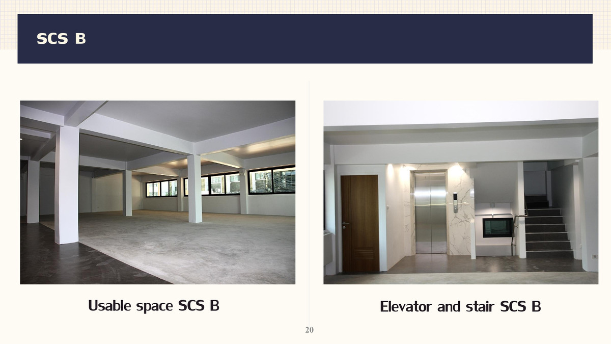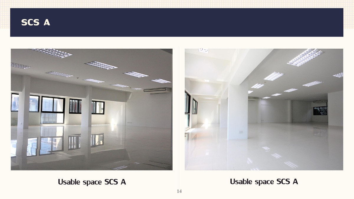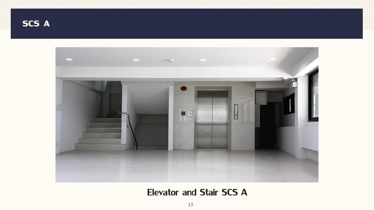 The Multipurpose Building "SCS" located in Metro Shopping Center on New Phetchaburi Road. The buildings have 6 units and 7 floors. with the total of 3,110 square meters living spaces. There are 2 elevators build in, fire exits on every floors and all the necessary infrastructures such as electricity lights, power outlet, internet outlet, water meters, communication cable, fire alarm, CCTV, air conditions and access control system. Furthermore, there are 12 parking spaces in front of the building and unlimited additional parking spaces around Metro Shopping Center. Near by places Hospitals : Distance from the building (KM) ▪ Phayathai 1 hospital 1.30 ▪ Police hospital 1.40 ▪ Bumrungrad hospital 2.30 ▪ Ramathibodi hospital 3.50 ▪ Rama 9 hospital 3.90 ▪ Bangkok hospital 5.60 Building Floor Total area (Sq.M) 1. 271.57 2. 266.57 3. 198.57 4. 198.57 5. 198.57 6. 198.57 7. 198.57 Total 1,530.99 Facilities Computer system : LAN system on every floor supporting to computer system Communication system : Line wiring supporting to telephone and computer system on every floor with outlet connecting LAN Sanitary system : Male and Female toilets on every floor 2 Septic tanks 2,000 liters Air-Conditioner : Electric line build in ready to install air -condition Security system: Standalone Fingerprint Access Control Brand HIP only on 1st floor CCTV Line build in ready for install (In 1st floor control room) Emergency light on every floor incase of power outage