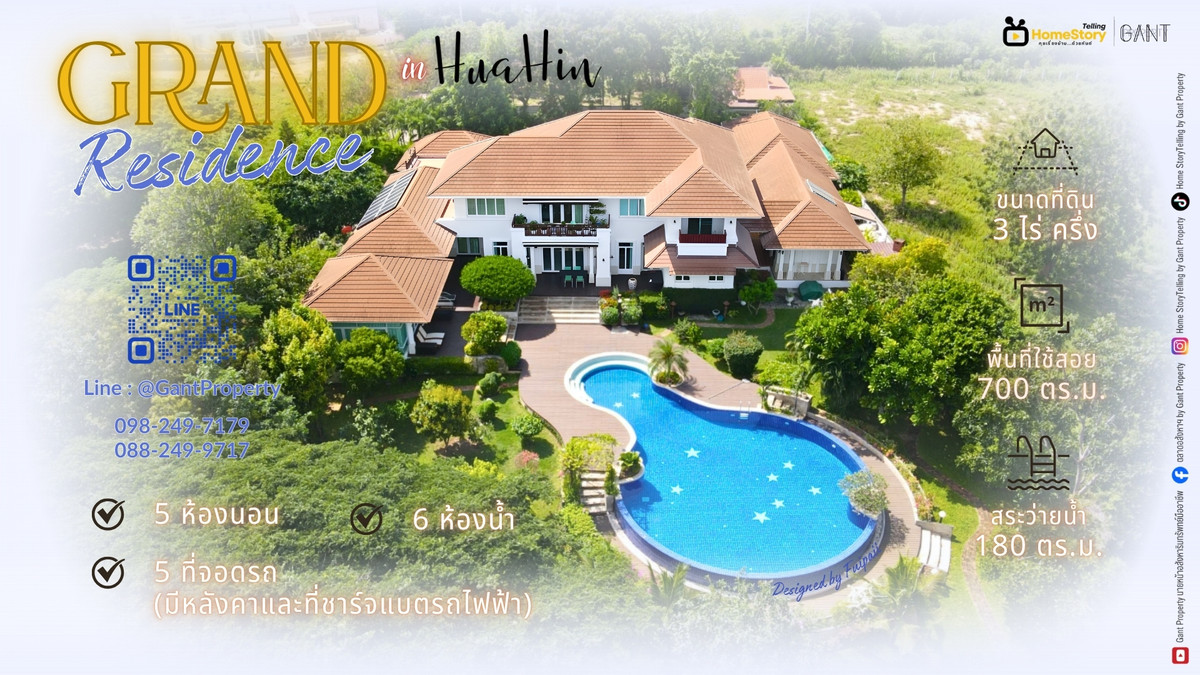 🌴 Luxury Private Mansion for Sale in Hua Hin – 3.4 Rai Estate with Resort-Style Pool (Gant-307) A rare opportunity to own an exclusive private luxury mansion in Hua Hin — Thailand’s most prestigious seaside resort town. This elegant estate offers unmatched privacy, tranquility, and resort-style living surrounded by lush greenery, yet only minutes from the beach and shopping district. 🏡 Property Highlights Land Area: 3 Rai 1 Ngan 55.8 Sq.wah (≈ 5,423 sqm / 1.34 acres) Living Area: 700 sqm 5 Bedrooms 6 Bathrooms Private Cinema / Entertainment Room 3 Multi-Purpose Rooms Private Fitness Room European Kitchen + Spacious Dining Area Outdoor BBQ Terrace 5 Covered Parking Spaces + EV Charging Station Maid & Driver Quarters 🏊‍♂️ Resort-Style Outdoor Living Private swimming pool 180 sqm with water-treatment system Beautiful landscaped garden Large patio & relaxation area Designed for comfort, privacy & family lifestyle 🌟 Key Features Peaceful & secure neighborhood — ideal for a holiday home or long-term residence No common area fees — full privacy & full control Built to international standards by an expat owner Premium imported materials & appliances Designed for luxury living, wellness, and entertainment 📍 Prime Hua Hin Location 2.5 km to BluPort Shopping Mall 3 km to Hua Hin Beach Close to restaurants, golf courses, hospitals, and international schools The perfect balance of luxury, privacy, and convenience — a rare gem in Hua Hin. 💰 Price: 65 Million THB 📞 Contact Khun Gant Tel: Contact number | Contact number 📱 Line: @GantProperty