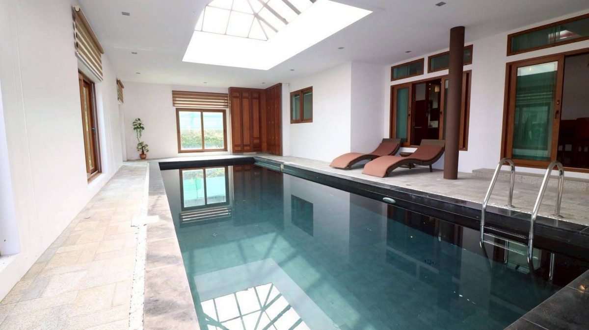 It is a 2-storey detached house on an area of 219 square wah, usable area 789 square meters (excluding terrace) in the Pran Village project, Central Ring Road.This is a premium luxury project in Chiang Mai. The design style emphasizes safety and is in a good environment. The project has only a few houses to support the business community - Hi-end society.The project is located in a prime location, easily accessible, near the airport, Royal Flora Ratchaphruek, and Night Safari. - Highlights: 360-degree open-air rooftop offering the best views in Chiang Mai, including Phra That Doi Suthep and Phra That Doi Kham. - Highlights: 360-degree open-air rooftop with the best views in Chiang Mai, including Phra That Doi Suthep and Phra That Doi Kham. - 4 bedrooms, 7 bathrooms, 1 maid's room, living room upstairs and green room downstairs. Fully furnished. Maid's bedroom with bunk beds, sleeps 3, includes bathroom and dressing room. - Fully furnished Western kitchen and Thai kitchen. - Private parking for 4 cars with storage room. - Indoor closed saltwater pool with a roof. - Fish pond. - Fully ducted air conditioning. - This is a pre-owned home. The owner is relocating to another province. It's in like-new condition and has been renovated to make it ready for use. For sale: 31 million baht. For more information, call Contact number.