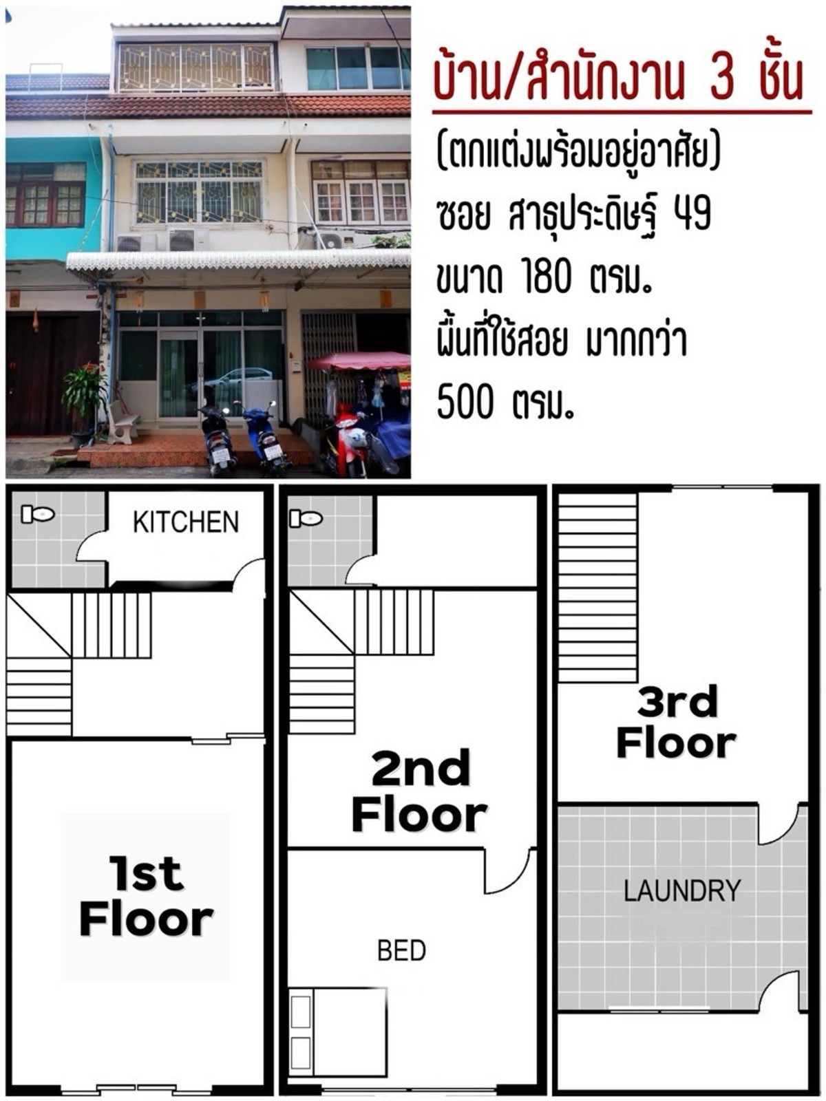 Shophouse for sale, Sathu Pradit 49. Agents welcome 3-storey shophouse with furniture. and electrical appliances Can park 1 car in front of the house Location: Soi Sathu Pradit 49 Near Dam Phochana Restaurant Google Map : https://bit.ly/3K3DJgA Characteristics of the house 1. The large living room on the first floor is a room separated by a glass door 2. 3 bedrooms (2nd floor has 1 large bedroom and 3rd floor has 2 medium sized bedrooms) 3. 2 bathrooms 4. 1 kitchen 5. Balcony Home furniture 1. Bed for main bedroom 2. Dining table 3. Large wardrobe 4. 2 work tables 5. Dressing table 6. Storage cabinet Home electrical appliances 1. 3 air conditioners (1 in the living room and 2 in both bedrooms) 2. Refrigerator 3. Washing machine 4. TV 5. Water heater Facilities near home -Near Chalerm Mahanakorn Expressway -The road in front of the alley connects to Rama 3 Road, Chan Road and Narathiwat Road 0.5 km 7-11 in front of the alley 1.5 km Rung Charoen Fresh Market 2 km Central Rama 3 2.5 km Tesco Lotus 3 km The up rama 3 3 km Int-Intersect Price 5.6 million baht Transfer fee, buyer and seller are responsible for half Interested in viewing the house? Please make an appointment 1 day in advance Contact Contact number, Contact number, Contact number Line : PEDBVER or 9PEY About to post for sale in the house selling app. Set the topic 1 line to make it interesting.