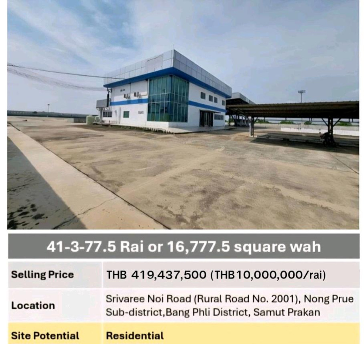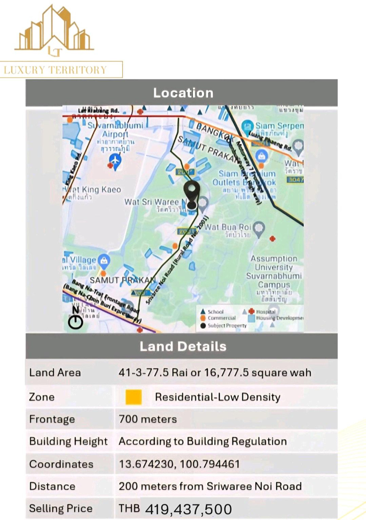 #LT301 💥ขาย ที่ดินพร้อมสิ่งปลูกสร้าง ศรีวารีน้อย จ. สมุทรปราการ 🔹เนื้อที่ 41-3-77.5 ไร่ ( 16,777.5 ตารางวา ) 🔹พื้นที่ สี 🟨 residential low density 🔹ไม่ต้องถม ปูพื้นคอนกรีต เรียบร้อย 🔹เพียง 200 ม. จาก ถนน ศรีวารีน้อย 🔹รถใหญ่ สิบล้อ เข้าได้ 🔹ใกล้สุวรรณภูมิ 💥รวมราคา 419,437,500 บาท (ไร่ละ 10,000,000 บาท ) สนใจติดต่อ FB : Luxury Territory ☎️ Contact number แอน ☎️ Contact number อั้ม ( Agent ) #ขายที่ดินศรีวารีน้อย #ขายที่ดินใกล้สุวรรณภูมิ #ขายที่ดิน