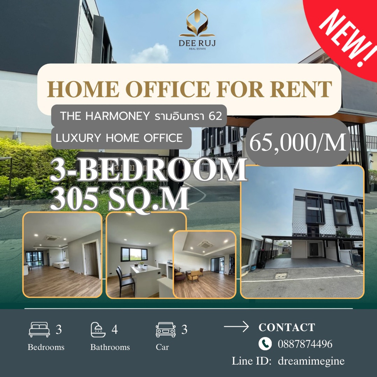 🏡 Luxury home office for rent, The Harmoney Ramintra 62. Premium location, near the Pink Skytrain & Synphaet Hospital only 900 m.✨ Behind the north corner Usable area 305 sq m. 3 parking spaces |