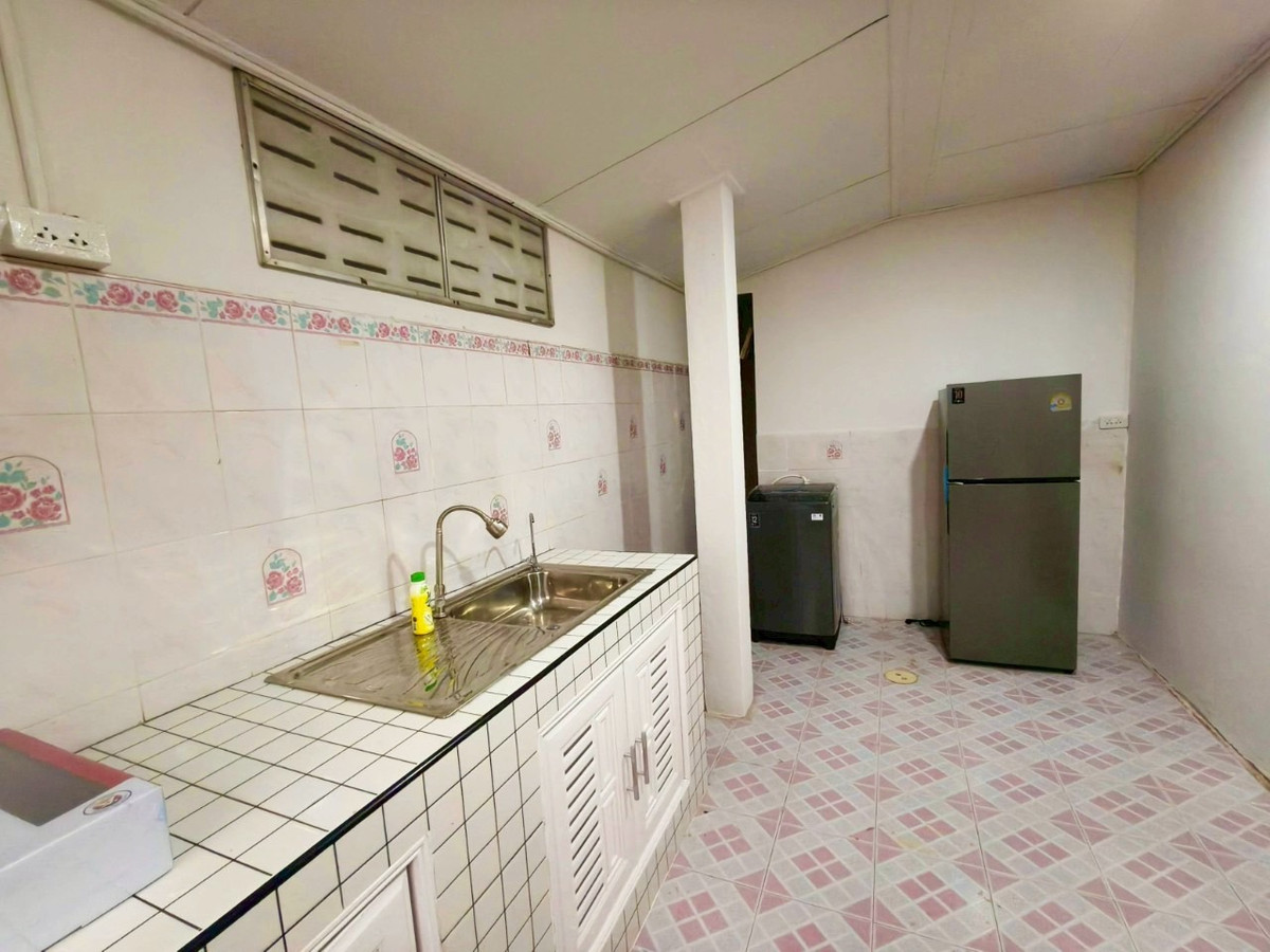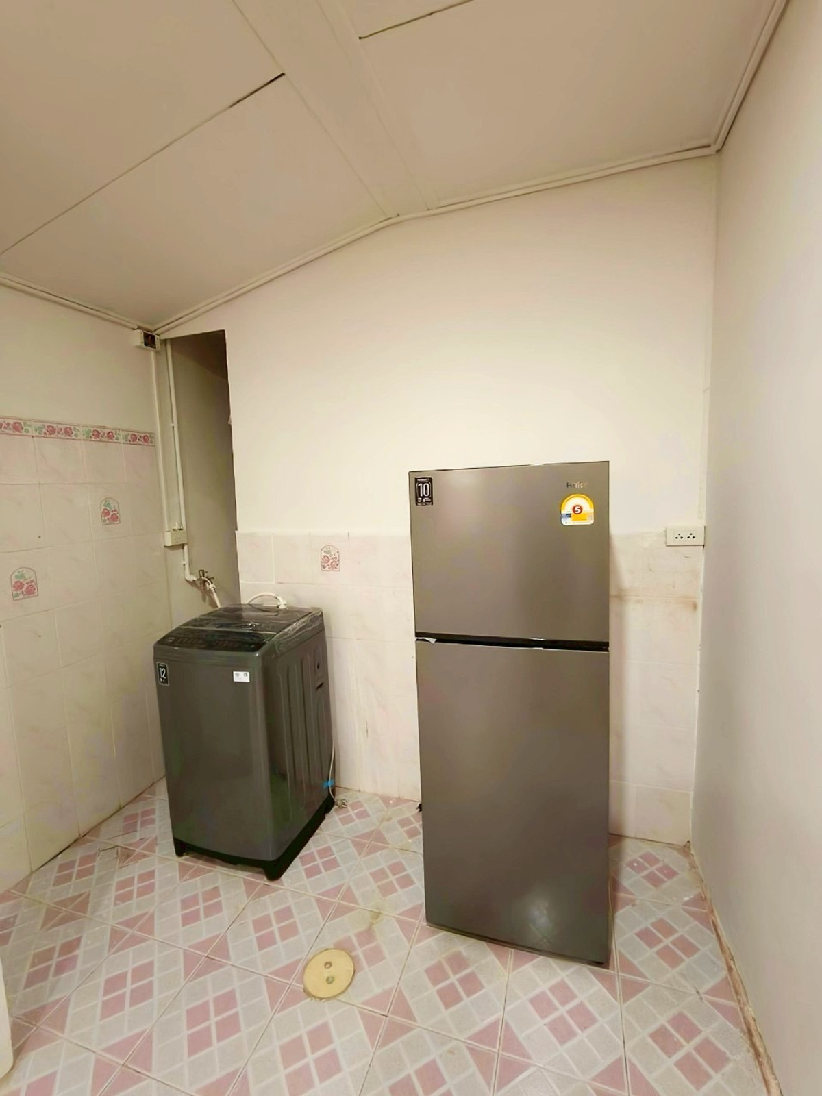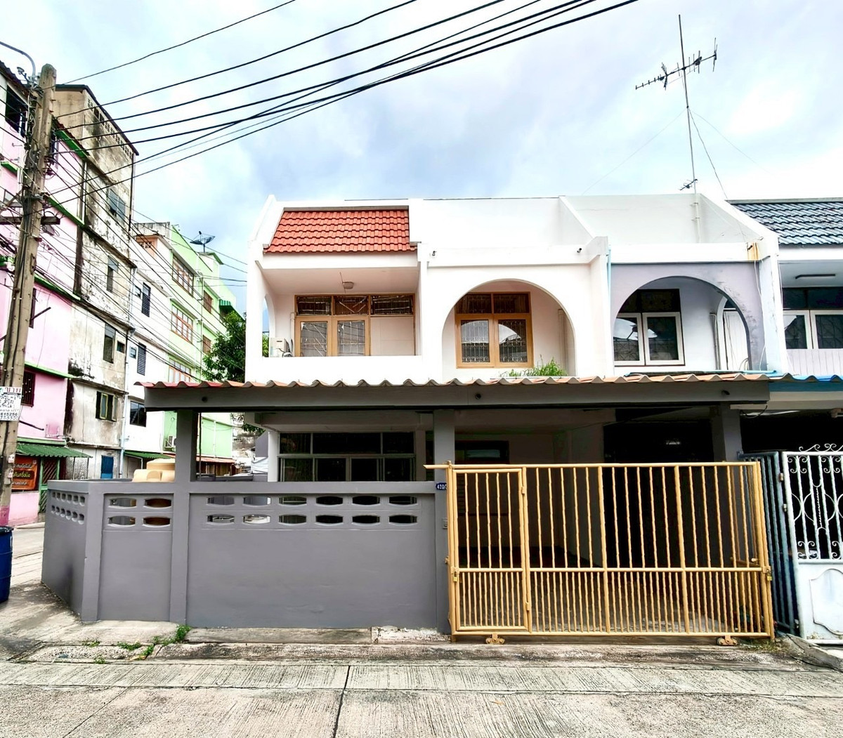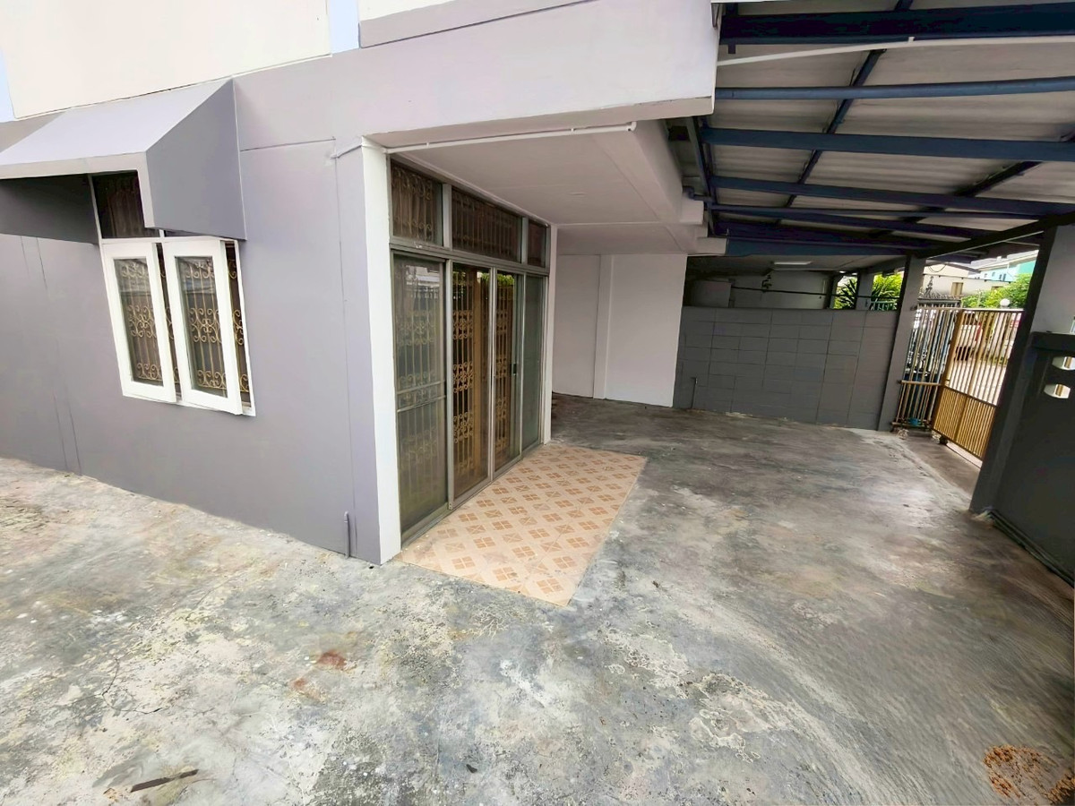 Townhouse for rent, corner house, 3 bedrooms, Thippawan Village. With furniture Just carry your bags and move in. Theparak Road, only 5 minutes walk to BTS Yellow Line, Thippawan Station, only 12,500 baht per month.
