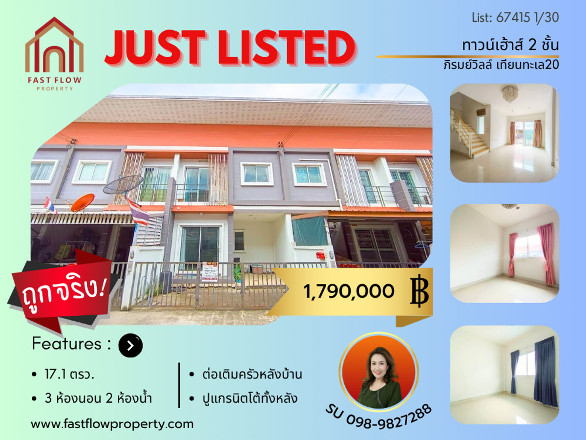 Townhouse for sale, Phirom Ville Thian Thale 20, best value in the project! Thai kitchen extension Entirely granite-floored townhouse in Bang Khun Thian, Kanchanaphisek Road, Rama II Road, PIROM VILLE, Soi Kamnan Malai, SU. Interested? Contact Suntaree (Su) Fast Flow Property at Contact number. Line ID: Susoontaree Listing No.: 67415 Property Details: - 2-story townhouse for sale in the Phirom Ville project, Thian Thale 20, Samae Dam, Bang Khun Thian. - Prime location at the beginning of the alley. - 17.1 square wah land area. - South-facing frontage, good ventilation. - 3 bedrooms, 2 bathrooms. - Thai kitchen extension at the back of the house. - Parking for 1 car in the fence. - Granite-floored on both floors. - Front of the house is free of power poles, clean, and safe. Project and Facilities: - 24-hour security. Nearby Locations: - Bang Khun Thian Road, Kanchanaphisek Road - Bang Khun Thian Transport Office - Central Rama 2, Big C Rama 2, Lotus Rama 2, HomePro Rama 2 - Rattanakosin Somphot Bang Khun Thian School, Sirinusorn Witthaya School, Charuwatthananukul School - Nakornthon Hospital, Bang Pakok 8 Hospital, Bang Pakok 9 Hospital Location: https://maps.app.goo.gl/ZULktgq9LB8TFfvE9 Price: 1,790,000 baht Free bank loan assistance! Visits are available daily. Price negotiable. Contact Khun Suntaree (Su) at Contact number Line ID: Susoontaree Email: Contact email Contact Fast Flow Property Office Tel: Contact number Line ID: @fastflow FB page: facebook.com/fastflowproperty www.fastflowproperty.com Real estate listing services for all types. Free advertising.