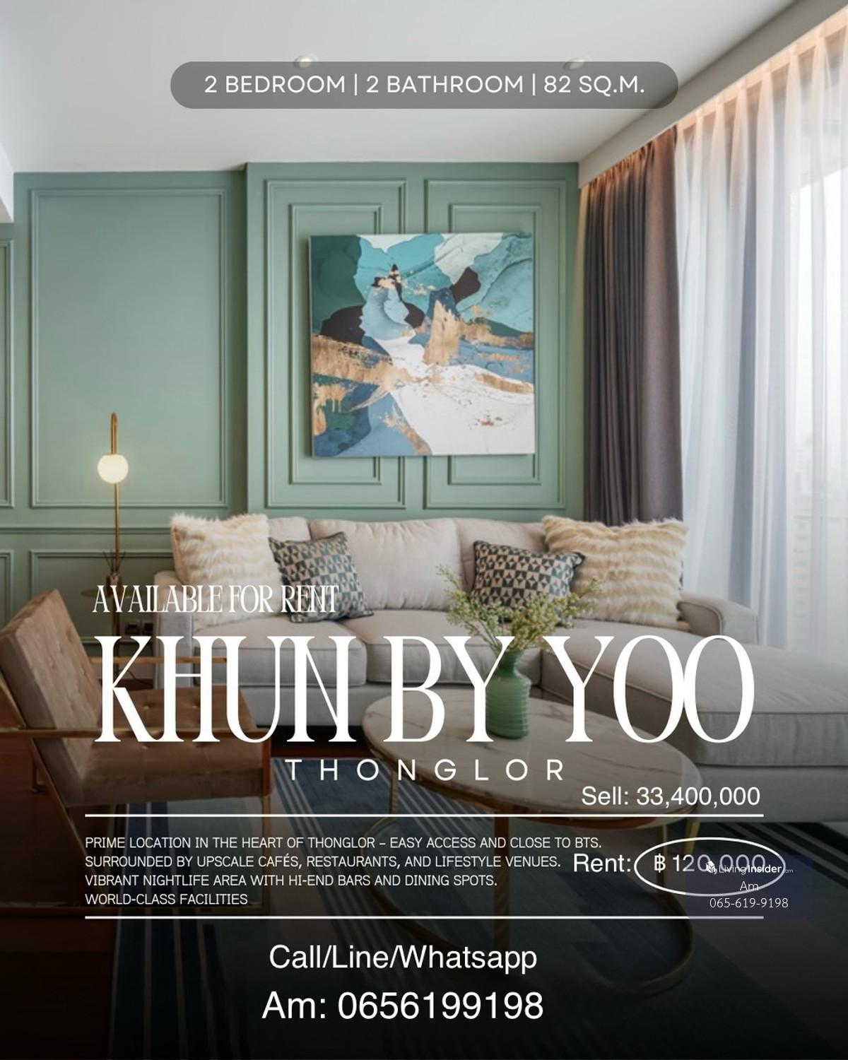 Khun by Yoo 2bed: 2bed 2bath 82sqm. Sell: 33,400,000 Rent: 120,000/mth. Am: 0656199198