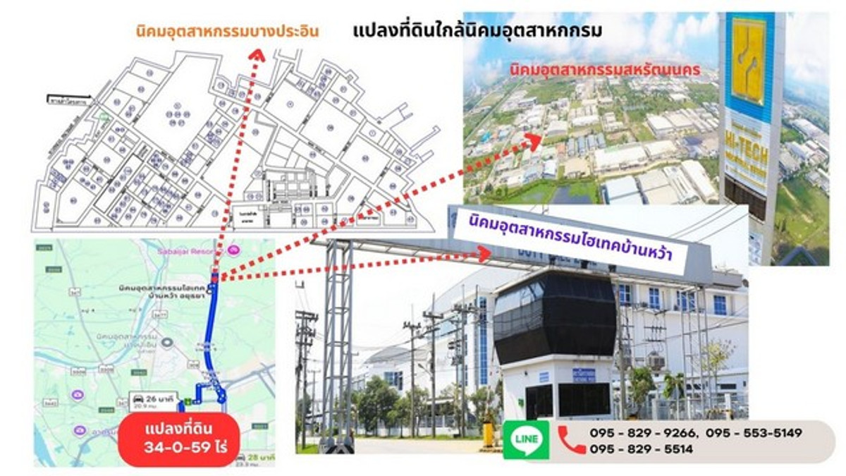 Cheap land for sale, good location, 34-0-59 rai (13,659 sq m). This plot of land is next to public roads on 2 sides and is also close to the main Phahonyothin Road. Next to Chiang Rak Noi and Ban Phon roads. and is expanding the Red Line from Rangsit Station. Arriving in Chiang Rak Noi, convenient to travel to Bangkok, Pathum Thani and Ayutthaya, and also close to Thammasat University, Rangsit Center, Bang Pa-in, close to many industrial estates, utilities, electricity, water, ready to live in the community, Chiang Rak Noi Subdistrict, Bang Pa-in District, Ayutthaya Points of interest: - Bang Pa-in Industrial Estate, about 20 minutes - Hi-Tech Industrial Estate, Ban Wa, about 32 Minutes - Saha Rattana Nakhon Industrial Estate approximately 50 minutes Land plot type - Front width next to the road on 2 sides, front width 40 meters (next to Chiang Rak Noi Road) - Another front width 90 meters (next to Ban Phon Road), depth approximately 1,105 meters Land location: next to Chiang Rak Noi Road, Chiang Rak Noi Subdistrict, Bang Pa-in District, Province Phra Nakhon Ayutthaya Highlights of the land: - Build a factory, warehouse - Distribution center - Logistics system center - For investment Nearby places: - Thammasat University Rangsit Center - Future Park Rangsit - Lotus Bang Pa-in - Mega Home Rangsit - Bangkok University - Rong Kluea Market - Chiang Rak Noi Municipality - Phatra-Thonburi Hospital Transportation: - Chiang Rak Noi Station - Chiang Rak Noi Road - Phahonyothin Road - Asia Road (32) - Pathum Thani-Bang Pahan Road (347) - Khlong Prem Prachakorn Road - Rangsit-Nakhon Nayok Road - Khlong Luang Road - Kanchanaphisek 9 Road - Udon Ratthaya Expressway Selling price 74,780,000 baht per rai. 2,190,000 baht 5,475 baht per square wa If interested, contact us Wanphen Mobile number and Line: Contact number, Contact number Narit Mobile number and Line: Contact number Wealth Success Real Estate Company Limited accepts consignments for sale of houses, land, condos, real estate. All types We service with a professional team (4289,6395)