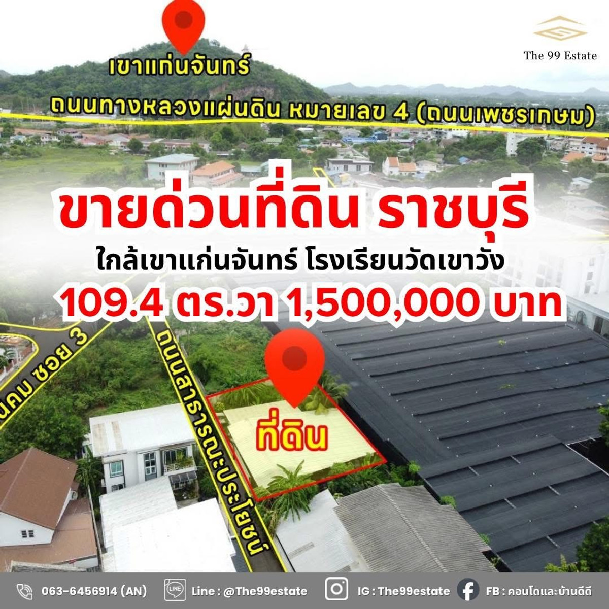 🏙️ Land for Sale – Na Mueang Subdistrict, Mueang Ratchaburi 📍 Near Wat Khao Wang School & PTT Khao Wang Gas Station ✨ Land Details Land size: 109.4 Sq.wah Width: 27 meters | Depth: 17 meters Yellow zone (residential area) Public access road in front Only 500 meters from Wisawa Senanikom Soi (opposite Wat Khao Wang School) Sub-soi: Kingkaew Village 💰 Selling Price: 1.5 MB 💵 Bank appraisal value around 1.4 MB* 📑 Transfer fee shared 50/50 🎁 Free transfer fee if transferred before year-end