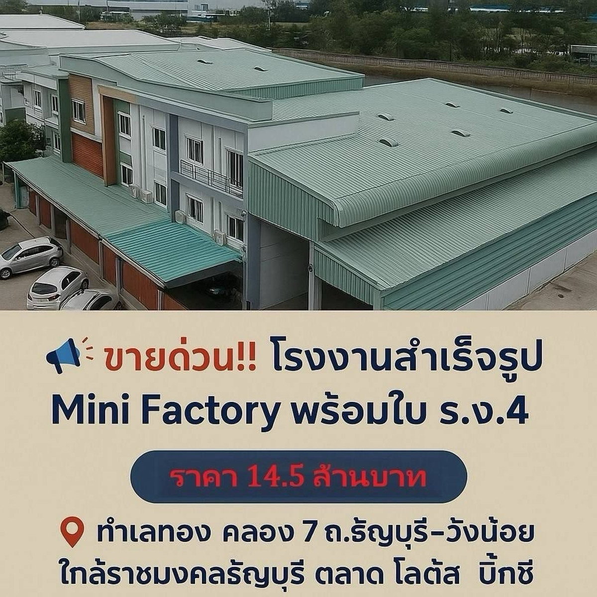 🏭 Selling a ready-made factory, Mini Factory, with factory certificate 4 📍 Ariyasap Project, Khlong 7, Thanyaburi-Wang Noi Rd. Pathum Thani Province 🔥 Energy discount of 5 hundred thousand! From 15 million down to only 14.5 million baht 🔥 📐 Area 185.5 sq m ✅ Location and project highlights: • Next to the main road Thanyaburi - Wang Noi Connecting the North, Northeast, East • First house on the right. No need to enter the alley. Easy entry-exit • The road in the project is 13 meters wide, poured with CPAC concrete and steel grid. Supports heavy use • Near Rajamangala University of Technology Thanyaburi, fresh market, Lotus, Big C, Do Home • No problems with road collapse or damage ✅ Suitable for: • Make a medium sized factory • Distribution/stocking center • Office + logistics area in one 📞 Make an appointment to see the place every day Call: Contact number | Contact number Khun Da 📲 Line ID: dada9030