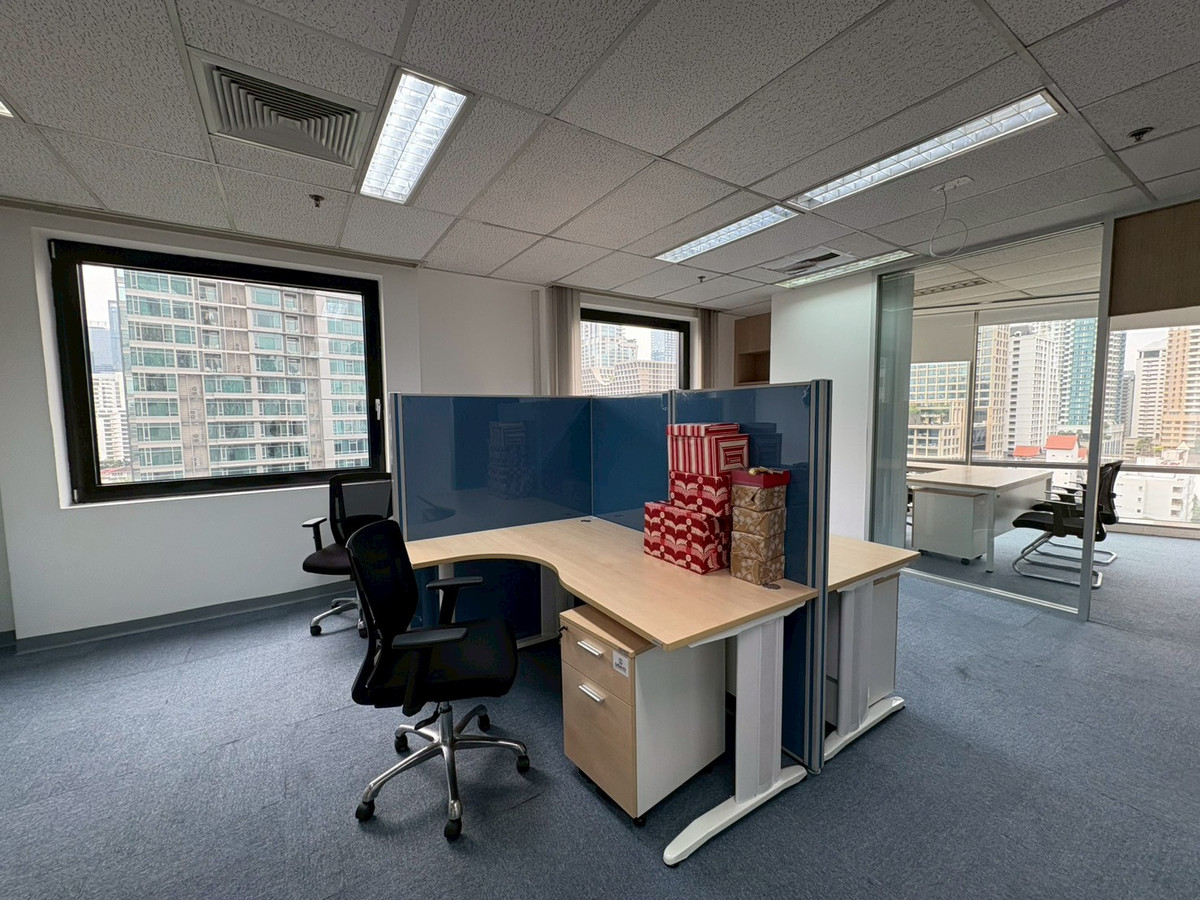 Office space for rent, size 204 square meters, on the 12th floor of 208 Wireless Road Building, located on Wireless Road. (CBD) Key Highlights: Fully Furnished: Tenants can move in and start operating immediately. (As in the picture) Proportional space allocation: The interior consists of Reception counter ,Open-Plan work area with table-chair set ,Executive room and meeting room (glass room divider) with furniture ,Filing cabinets and lockers ,Server room /storage room Location and scenery: The office is a corner room. Get an open city view Rental details: Building: 208 Wireless Road Building Area size: 204 square meters Floor: 12 Rental rate: 1,000 baht per square meter (including common fees) Condition: Fully furnished with furniture (Fully Furnished)