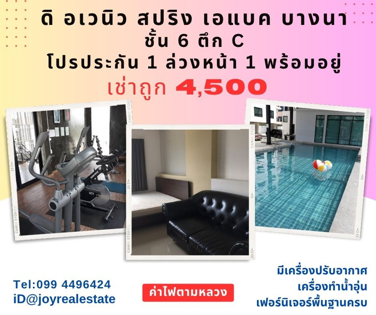 📌Condo for rent, The Avenue Spring at ABAC Bangna, 6th floor, Building C, insurance promotion 1 in advance, 1 rental price, 4,500 baht Studio room type, 1 bathroom, size 23 sq m. 📌Free service to find a condo room at the desired price 📌Electrical appliances -air conditioner -Water heater 📌Furniture -Built-in kitchen counter -Bed with mattress -Built-in TV shelf -Multi-purpose table -Built-in wardrobe -2 chairs -Curtains -Sofa 📌Amenities -Fitness and swimming pool -24 hour security guard 📌Nearby places -Close to Assumption University, only 8 minutes -Close to Huachiew University, only 15 minutes Joy☎️ Contact number🆔@joyrealestate Accept consignment for sale/rent Real Estate JOY Real Estate
