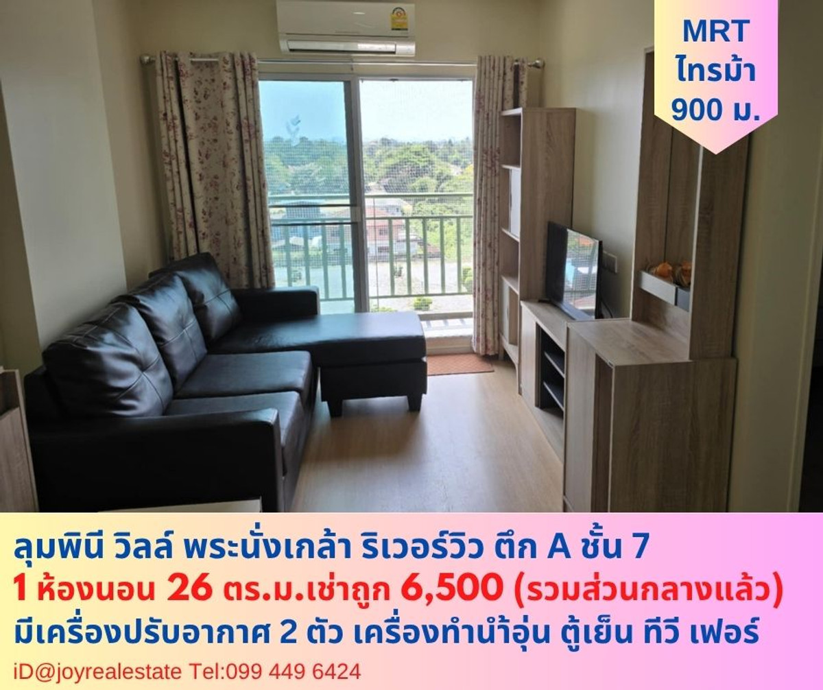 📌Condo for rent Lumpini Ville Phra Nang Klao Riverview, Building A, 7th floor, cheapest rental price 6,500 baht 1 bedroom, 1 bathroom, size 26 sq m 📌Electrical appliances - 2 air conditioners - Water