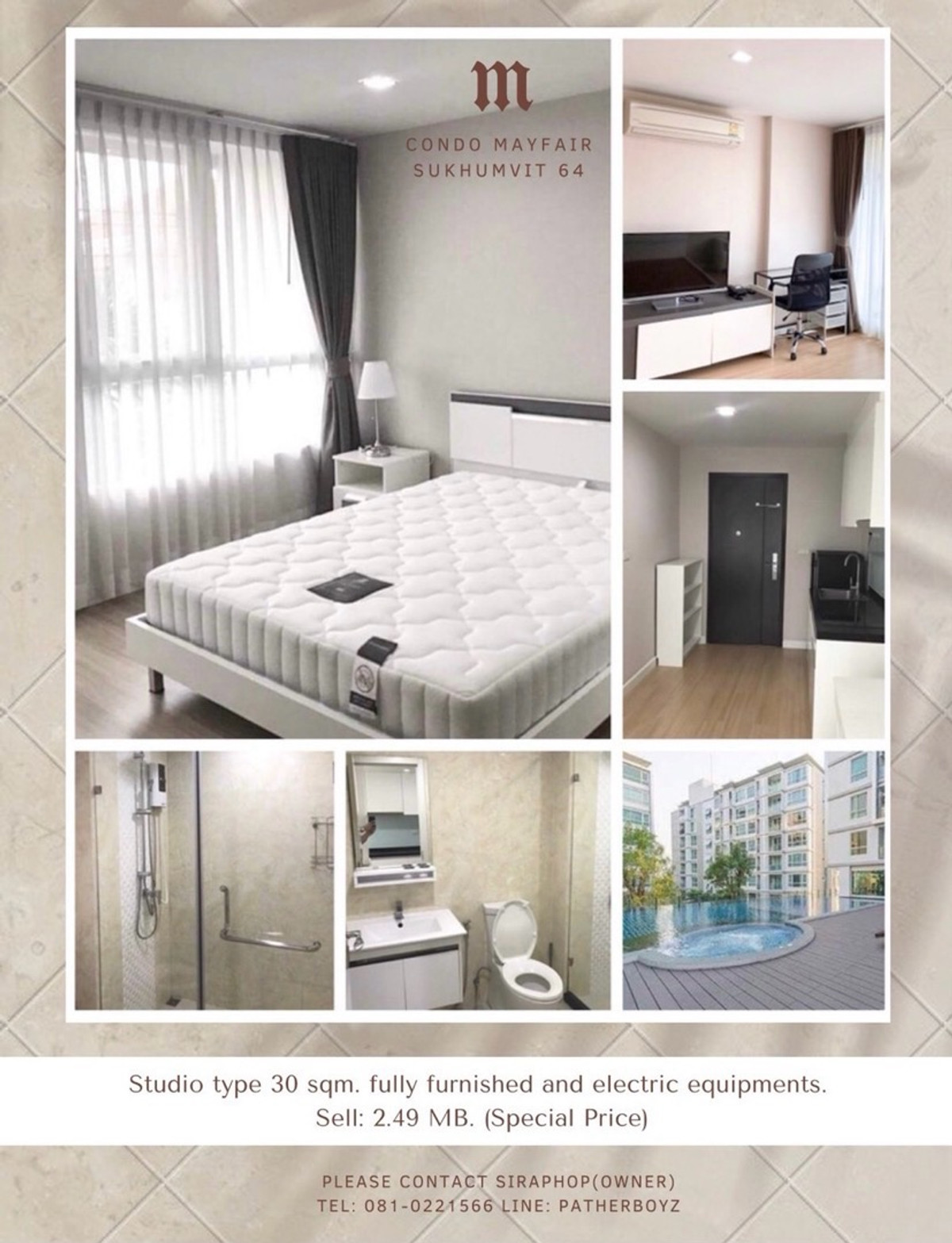 💢Condo for sale Mayfair place Sukhumvit 64 (next to BTS Punnawithi only 300 m.) Special price💢 (Owner post) (English version below) 💢Special price 💢 Condo, private atmosphere. Not crowded, 50% parking, Studio room size 30 sq m. The room is on the 3rd floor, same floor as the swimming pool, fitness room and steam room. In the room there is ready-to-move-in furniture , electrical appliances, TV, refrigerator, washing machine, microwave, water heater and electric stove with suction cup Condo has fitness, swimming pool, steam room, reading room, there is a tuk tuk service to Punnawithi BTS station Selling price 2.19. MB Transfer fee is half 💢Sell Condo at Mayfair Sukhumvit64💢 Studio type 30 sqm. fully furnished and electric equipments such as TV, Fridge, Washing machine, water heater, Microwave and electric stove Third floor. The same floor with all facilities such as swimming pool, steam room, reading room, gym. There is shuttle bus service to BTS Punnavithi. Walking distance to BTS (300 meters) sell 2.19 MB. Please contact Siraphop(Owner) 📞Tel: Contact number 📳Line: patherboyz