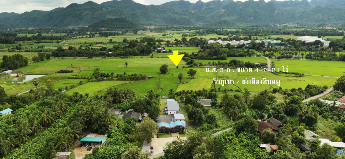 Land with Café and Houses for Sale – 4-2-21 Rai (≈1,821 sq.wah) Panoramic Mountain & Rice Field View – Kaeng Sian, Mueang Kanchanaburi An investment opportunity that blends nature, business, and creativity in one unique location. This 4-2-21 Rai