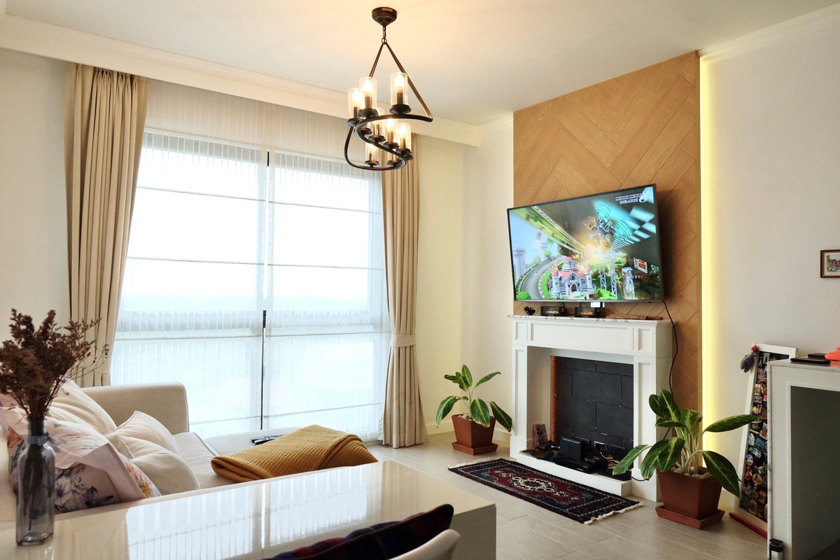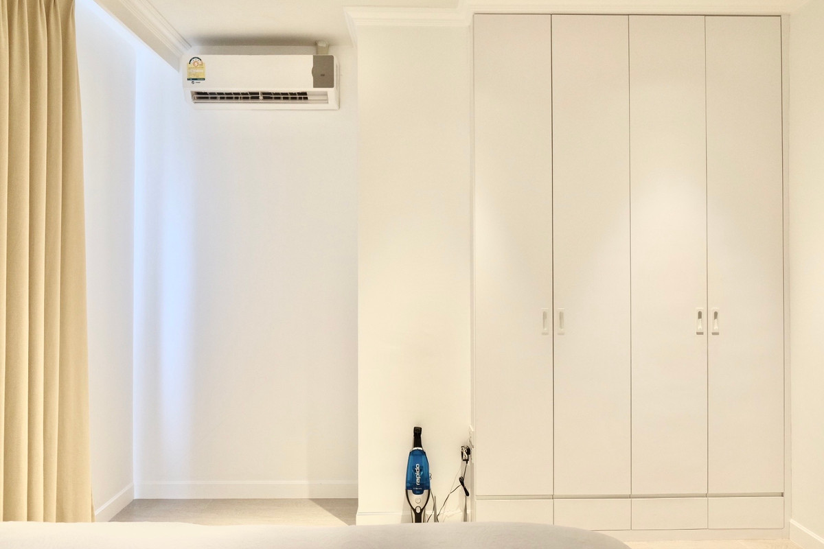 Room with built-in decorations simple white minimalist The atmosphere is warm and comfortable with lights that can be adjusted according to the mood. The room will face the building and see the sunrise behind the mountains every morning. The weather is fine in the afternoon. The kitchen utensil set can be used for cooking, consisting of 4 infrared electric stoves, an oven, a microwave, a refrigerator, and a storage cabinet to keep the room from looking cluttered. There is regular parking in front of the building. Easy to walk up and down between the elevator and the room.
