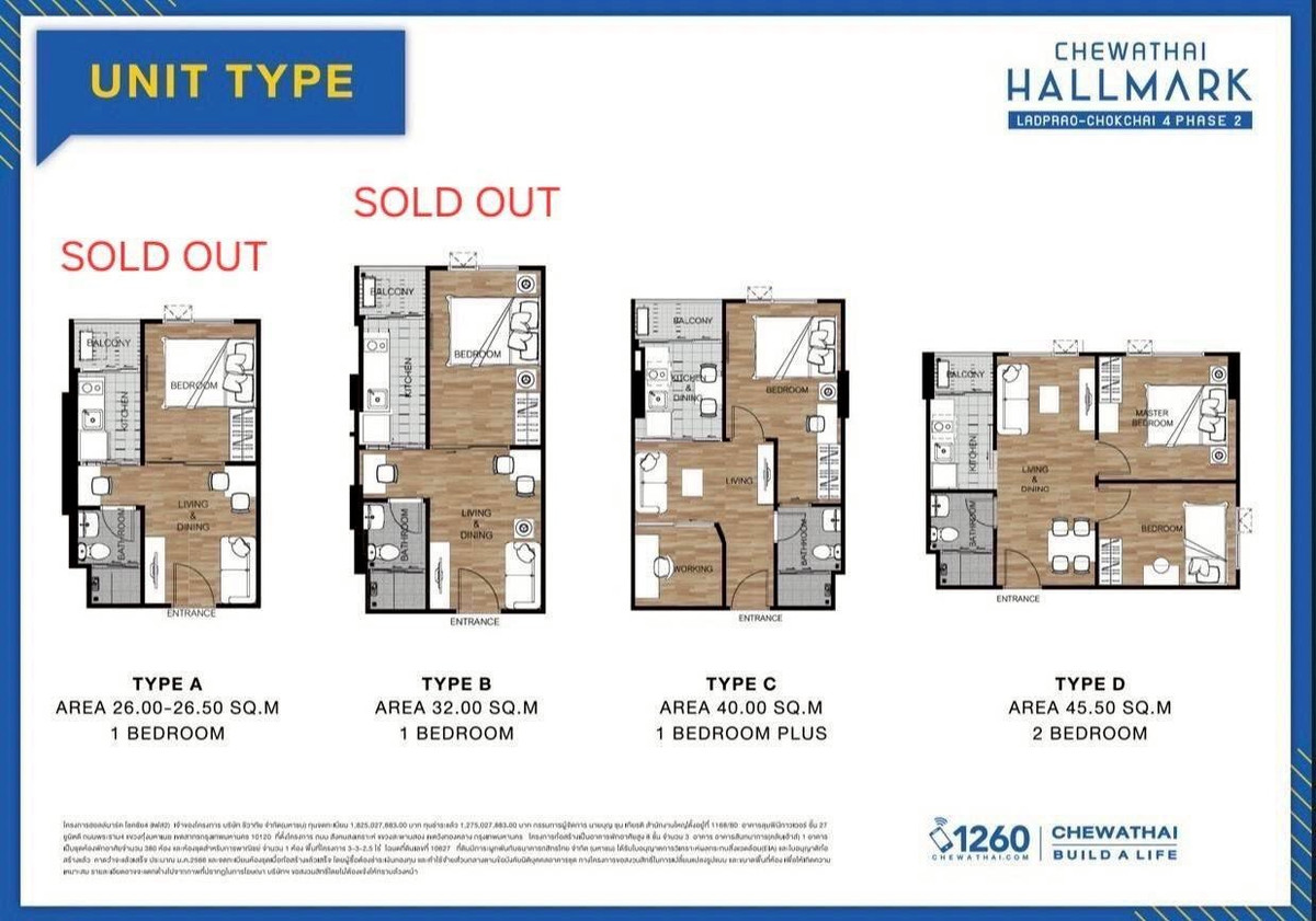 📌 Chewathai Hallmark Ladprao Chokchai 4 (Phase 2) Near 3 BTS lines!! Details ✨ Chewathai Hallmark Ladprao - Chokchai 4 Phase 2 Pet-friendly. This new project from Chewathai Public Company Limited is located on Sangkhom Songkhro Road, Saphan Song Subdistrict, Wang Thonglang District, Bangkok. ✨ Outdoor view, very spacious room!! Building D 5th floor Over 39.91 square meters of usable space There are many rooms to choose from, in a great location. Ideal for personal use or investment. ✨ There are 4 types to choose from: Type A: 1 Bedroom, usable area 26.00-26.50 sq.m. Type B: 1 Bedroom, usable area 32.00 sq.m. Type C: 1 Bedroom, usable area 40.00 sq.m. Type D: 2 Bedrooms, usable area 45.50 sq.m. ✨ Conveniently located near Lat Phrao Road, Ratchadaphisek Road, Kaset-Nawamin Road, Ram Intra Expressway, and Chalong Rat Expressway. Near the Yellow, Blue, and Gray Lines (future projects) ✨ Shopping Malls/Markets - Family Mart: 120 m. - 7-Eleven: 240 m. - Chokchai 4 Market: 1.0 km. - HomePro Ramintra: 1.9 km. - Lotus's Ramintra: 2.4 km. - Central Eastville: 2.5 km. - MaxValu Wang Hin: 3.3 km. - The Crystal Nawamin: 3.5 km. - Lotus Wang Hin: 3.9 km. - Makro Wang Hin: 4.0 km. - Hua Mum Market: 5.1 km. - Union Mall: 5.7 km. - Central Ladprao: 6.1 km. - Major Ratchayothin: 6.5 km. ✨ Hospitals - Paolo Chokchai 4 Hospital: 850 m. - Paolo Hospital Kaset: 7.1 km ✨Educational Institutions - Chandrakasem Rajabhat University: 5.0 km - Satriwitthaya 2 School: 5.2 km - Horwang School: 6.6 km - Kasetsart University: 7.9 km - Sripatum University: 9.1 km ✨Government Offices - Phra Nakhon Nuea District Court: 4.2 km - Court of Appeal: 4.4 km - Civil Court (Ratchadaphisek): 4.5 km ✨This unit is priced at only 3.98 million baht!!!!! ☎ Contact ✔️ Line ID: amorn663576 ✔️ WhatsApp: Contact number ✔️ Mobile: Contact number ✅️ Viewing appointments available daily