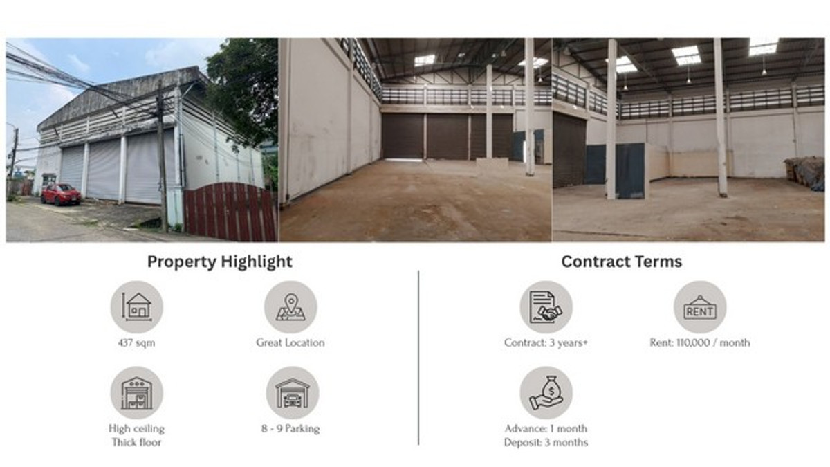 Warehouse for rent 437 sq m suitable for gym, fitness, product showroom, large restaurant, Chaeng Watthana Lak Si area near MRT Government Center, MRT Chaeng Watthana 14, red city plan Rental price 110,000 baht / month (1 month advance payment, 3 month warranty, 3 year contract at a time) Location Chaeng Watthana Rd., Soi Chaeng Watthana, Lak Si District, Thung Song Hong Subdistrict. Bangkok 10210 https://www.facebook.com/profile.php?id= Contact number Contact : Mr. Phatsapong Contact number Line : binkem22 Area 151 square wah, 1 floor, parking in front for 8 - 9 cars - Building area 437 sq m. - Roof height 10 m. (can add a mezzanine) - High ceiling, suitable for businesses that need open space or add a mezzanine - Thick floor, can support high weight. Strong and suitable for commercial use - next to the government center. There are tens of thousands of people coming in and out per day - near the BTS, Si Rat Expressway. and tollway - near MRT Government Center (600m) - near MRT Chaengwattana 14 (500m) suitable for doing business - gym, fitness or exercise studio - product showroom - large restaurant - other uses that require high ceilings Or a thick floor that can support a high weight Rental price 110,000 baht / month (1 month advance payment, 3 months warranty, 3 year contract) Location: Chaeng Watthana Rd., Soi Chaeng Watthana, Lak Si District, Thung Song Hong Subdistrict. Bangkok 10210 https://www.facebook.com/profile.php?id= Contact number Contact : Mr. Phatsapong Contact number Line : binkem22 PL. Real Estate Broker http://www.kaibaanteedin.com Service for selling condos, houses, land, all types of real estate.