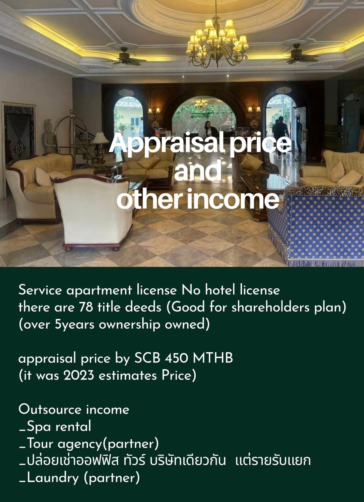 Detail -Pattaya inner ring area -Land Area 638.5 sq Wah -No. of Units 70 (No. of Bedrooms: 84) -Facilities Spa Gym Pool Steam Sauna Restaurant -Opening Date Mid 2008 -No. of Stars 4 Stars with (5 Stars Luxury at 4Star Price) -Built Up Area: 9,800 Sq. m. Note: - italian kitchen in every rooms - bar/restaurant next to pool - Pitch decks, insight details please contact me via line id. Contact number( Khun Mia ) Open for any option and negotiate, Please discuss