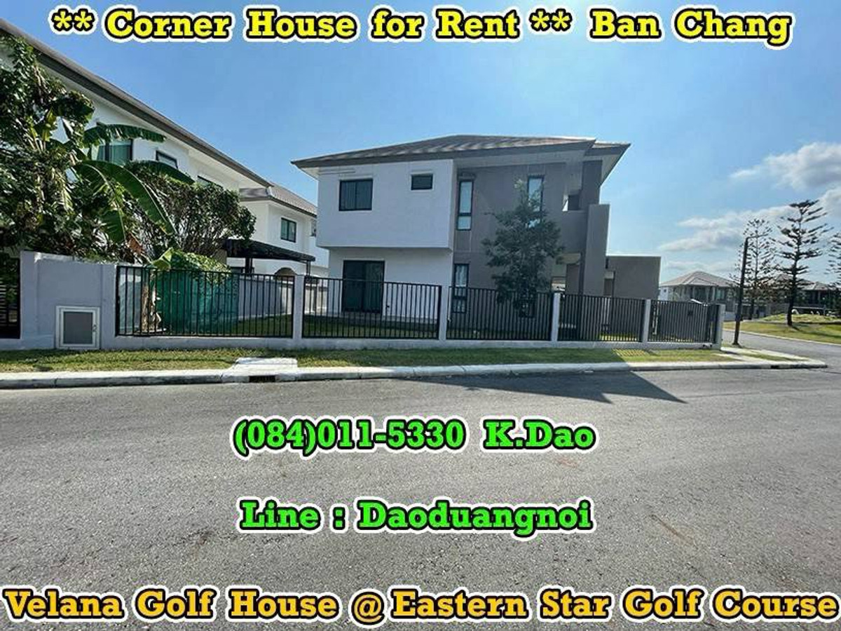 *** Corner House for Rent *** Velana Golf House, Ban Chang Located in Eastern Star Golf Course. 2-Storey House The Biggest Type (Type L) Land Area 71.4 Sqr.wah House Area 247 Sqr.m. 3 Bedrooms 4 Bathrooms (Ensuite-Bathroom) 1 Office Room 1 Living Room 1 Family Area 1 Balcony 1 Kitchen 1 Storage Room 1 Laundry Room 1 Terrace 2 Parking Fully Furnished +++ Remote-Controlled Gate +++ Facility - Swimming Pool - Fitness - Community Park - Keycard for enter the village's gate *** Rental Fee 45,000 Baht *** Near Motorway Near U-Tapao International Airport Near Garden International School Near Natural Surroundings Near the Beaches Location : https://goo.gl/maps/FrENrEjj4WeomDiB9 Contact for renting with Dao. Tel. : (084)011-5330 Line ID : Daoduangnoi WhatsApp : Contact number https://www.facebook.com/ThePastelProperty