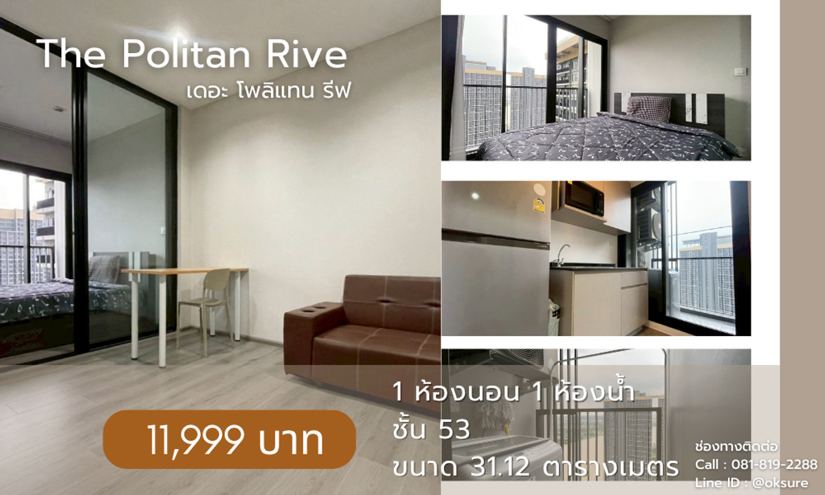 💎Condo for rent The Politan Rive, located on the Chao Phraya riverside, near MRT Phra Nang Klao Bridge 📍Close to MRT Phra Nang Klao Bridge and Tonson Market Price 11,999 baht 📱 Line id @oksure 🔹1 bedr