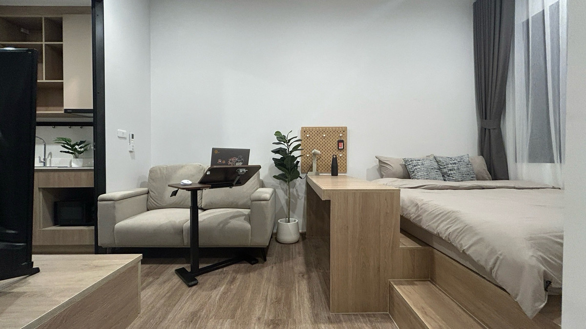 Project name: Floor: 7 Size: 23 sq m Room type: studio Minimum 1 year contract Price: 9,000฿ Furniture🛋️ Electrical appliances🔌 bed + Bedding set Sofa + Work table Wardrobe Kitchen counter Dressing ta
