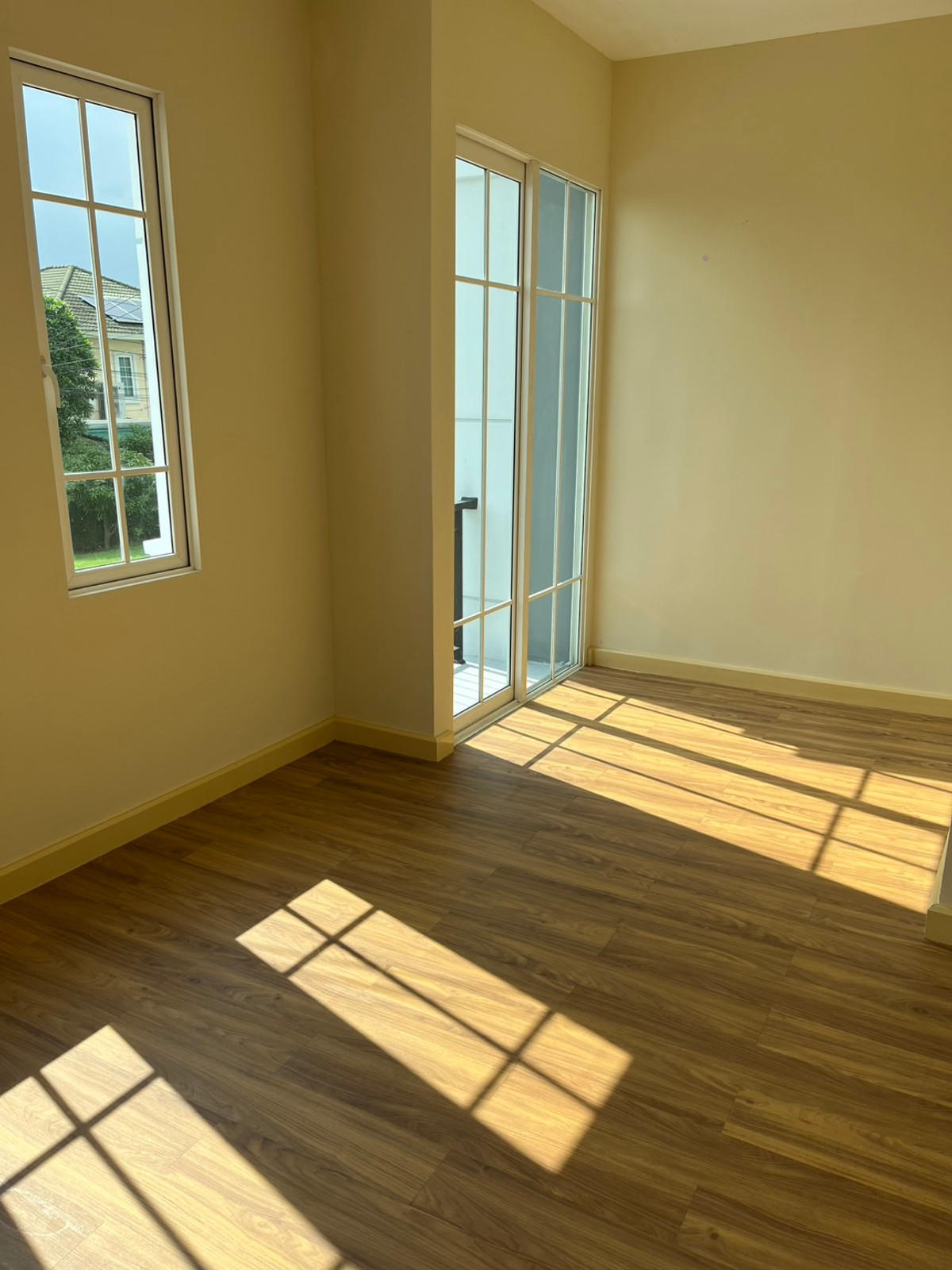 2-story townhouse for sale, corner house, not cramped, has windows on both floors next to the house. There is no house opposite. Opposite is a wide grass field. Convenient parking Golden Town Village 3 Bangna-Suan Luang Kanchanaphisek Road