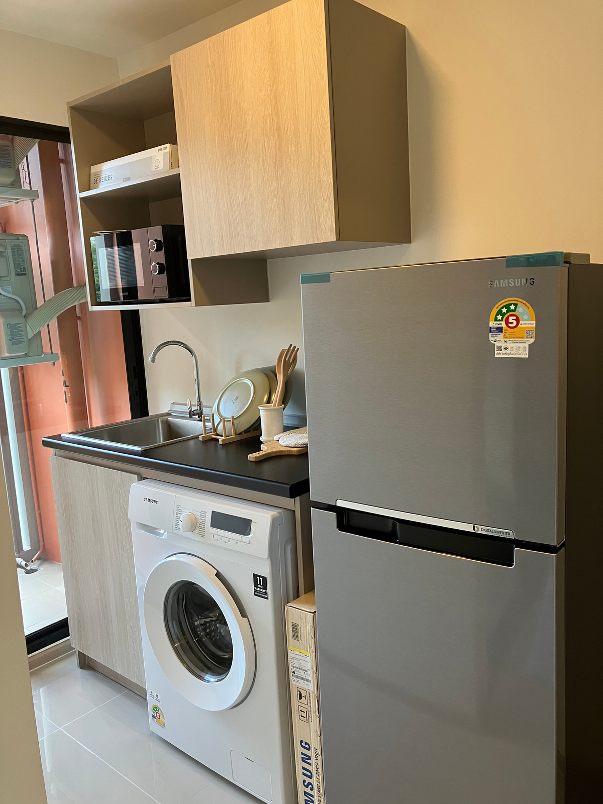 D Condo Well, new condo, Ao Udom intersection 🌟 ❤️ next to Kasetsart University, Sriracha, gate 1 rent 7,500 baht, insurance 10,000 baht ✅ fully furnished ✅ complete electrical appliances refrigerator washing machine Water heater TV Sofa Dining table available 16 Dec. 2025 new room 👍 ☎️ Ask Dao Contact number Building B, 5th floor view outside the project 🌳 🏡 The owner lets it out himself not accepting agents.