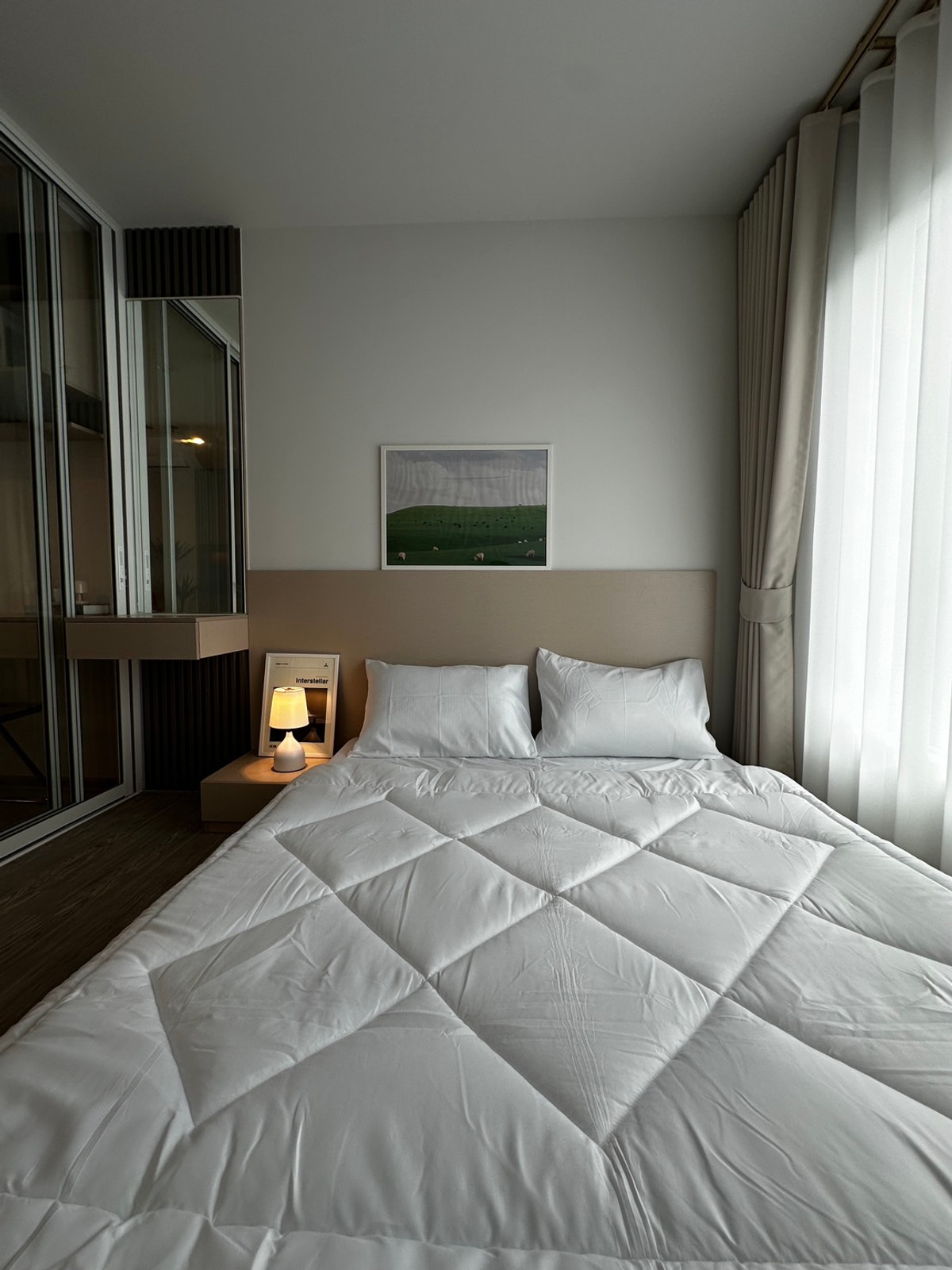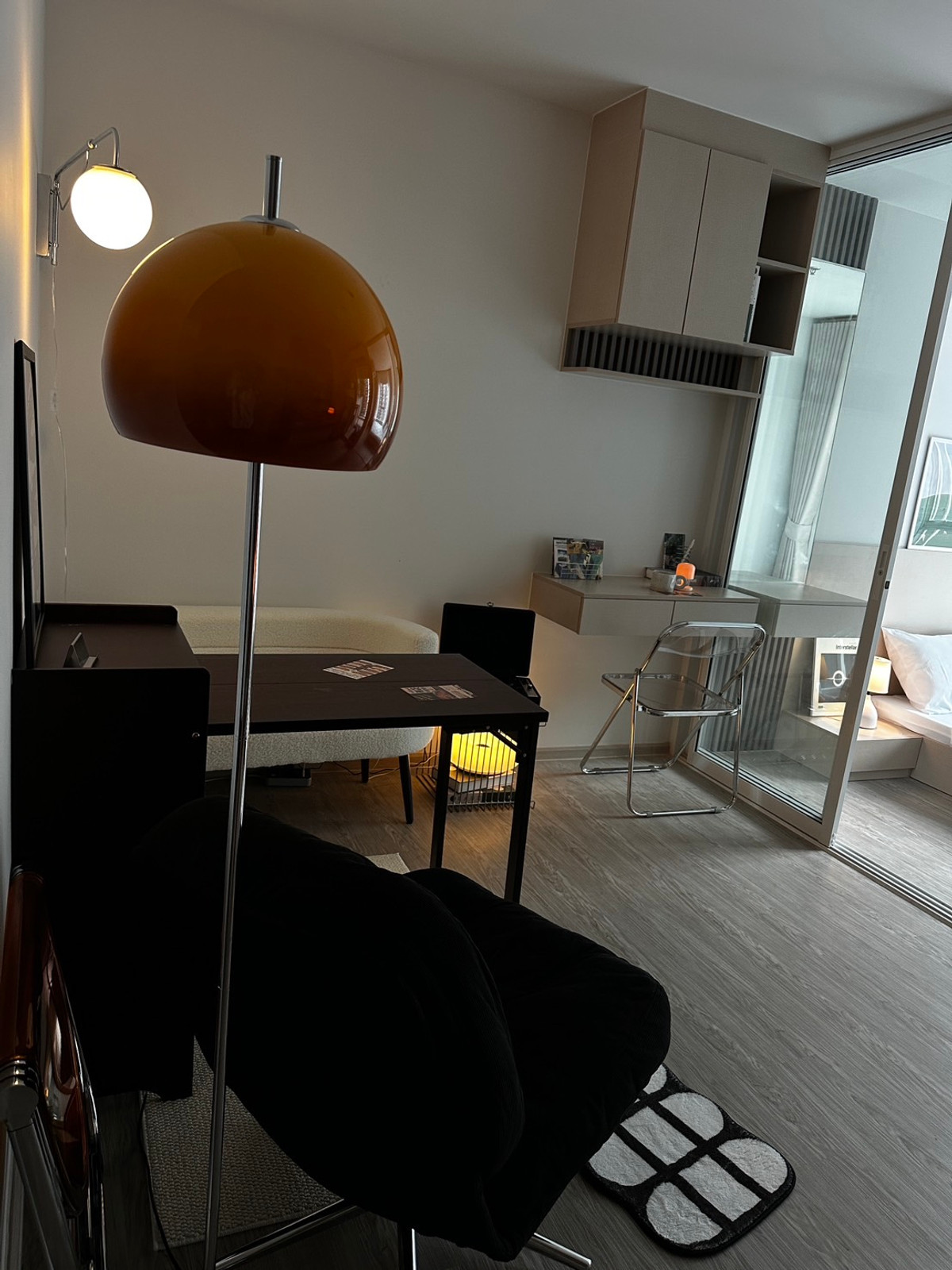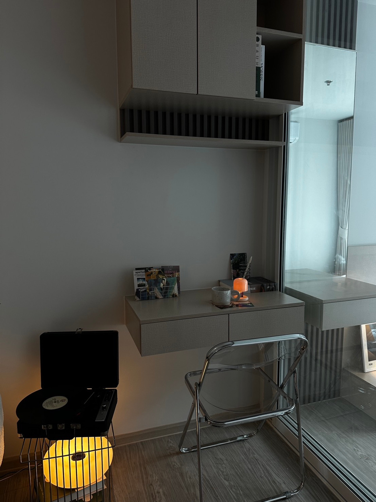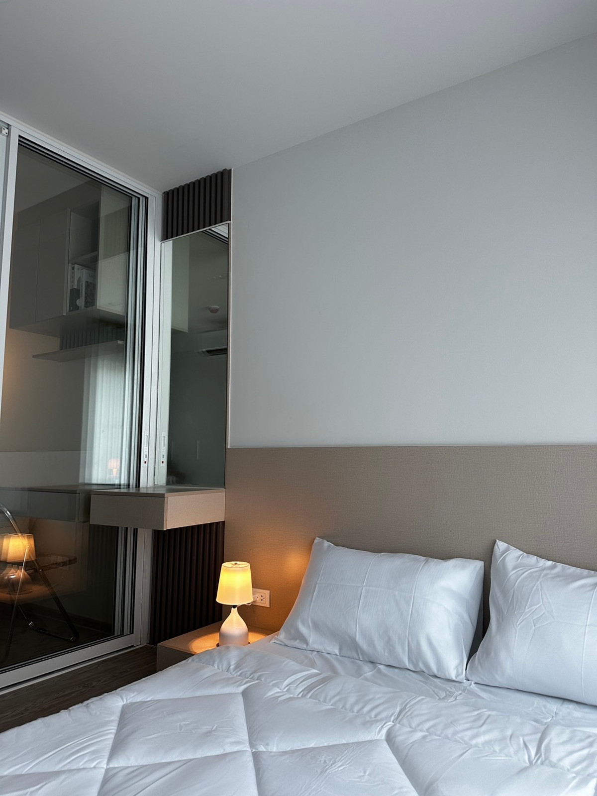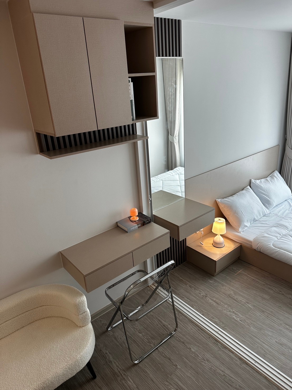 Room 28 sq m, 20th floor, east side, beautiful pool view, no blocking buildings separating the bedrooms, fully furnished, ready to move in 1 Jan. Rent: • 1 year contract: 11,000 baht/month • 2 year contract: negotiable Plenty of freebies! Digital Door Lock Smart TV Toshiba 43" Sliding glass door separating the bedroom/living room • kitchen glass door (Excellent odor protection) • Japanese bed, dressing table Work desk • Minimalist kitchen set, wardrobe, shoe cabinet • The bathroom door knob is super cute Complete condo, ready to move in, very convenient, walk to BTS only 350 m.
