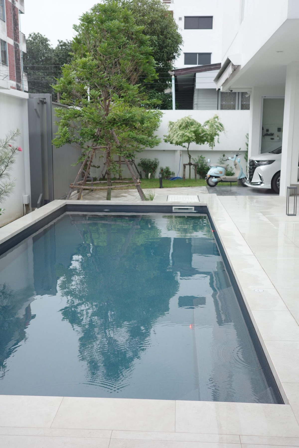 SALE/RENT Single house with swimming pool, Lat Phrao 64, just 5 minutes to BTS Lat Phrao 71 New house, beautifully decorated, ready to move in, made from "ceramic bricks". Whole house ✅ Details :: - Land: 100 sq m - Usable area: 440 sq m - Bedrooms: 3 (every room has its own bathroom) - Bathroom: 5 - Living room: 1 - Kitchen: 2 (Thai and Western) - Maids room: 2 - Parking: 4 White house, very minimal backyard area. Next to the house and swimming pool Ozone mineral water system entrance area of the house Foyer Double glass living room, kitchen, dining, Thai kitchen Stairs to the 2nd floor, floating type, specially made oak wood --------------------------------- RENT : 300,000 baht SALE : 30,000,000 baht --------------------------------- For more information please contact Khun Big Call : Contact number Line : big Contact number