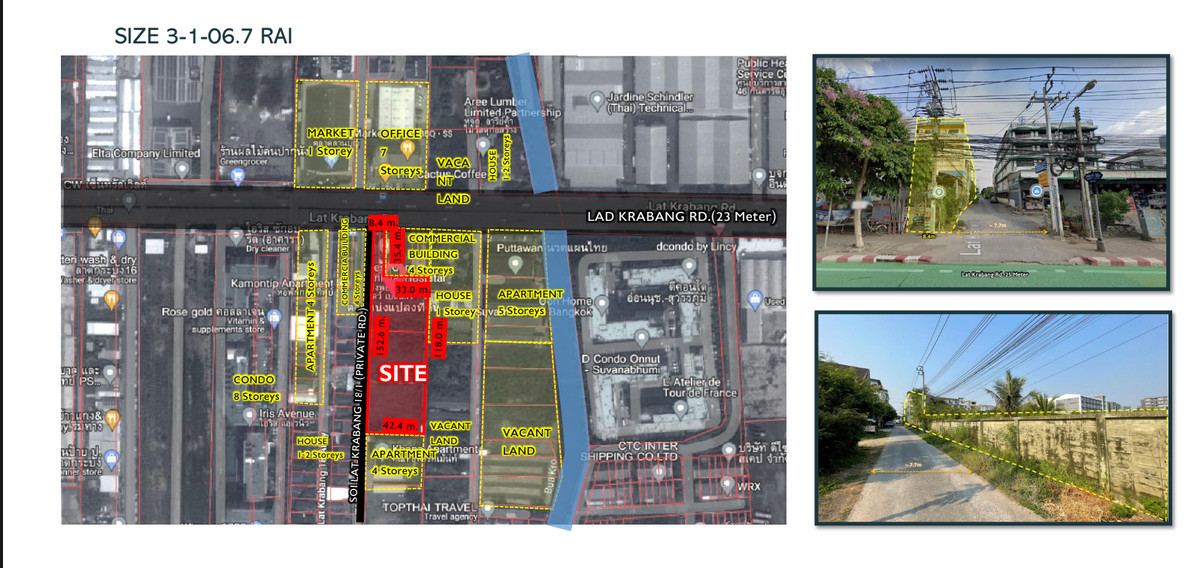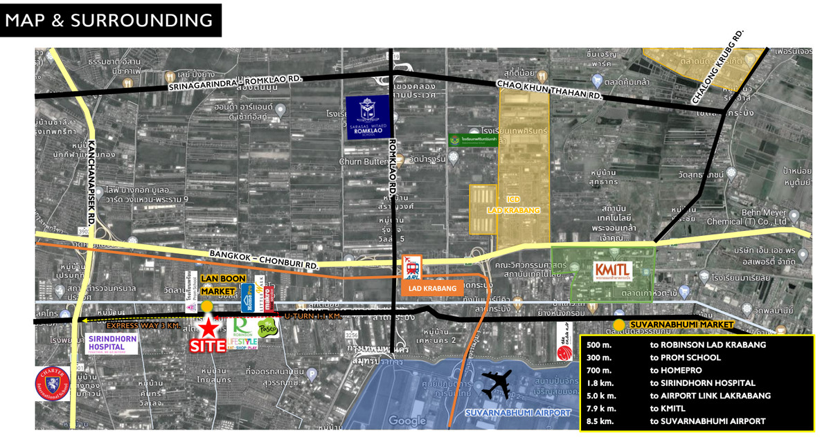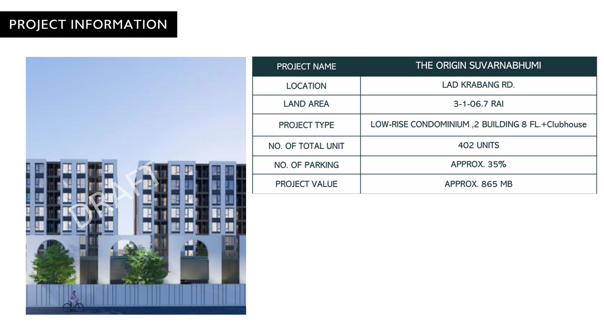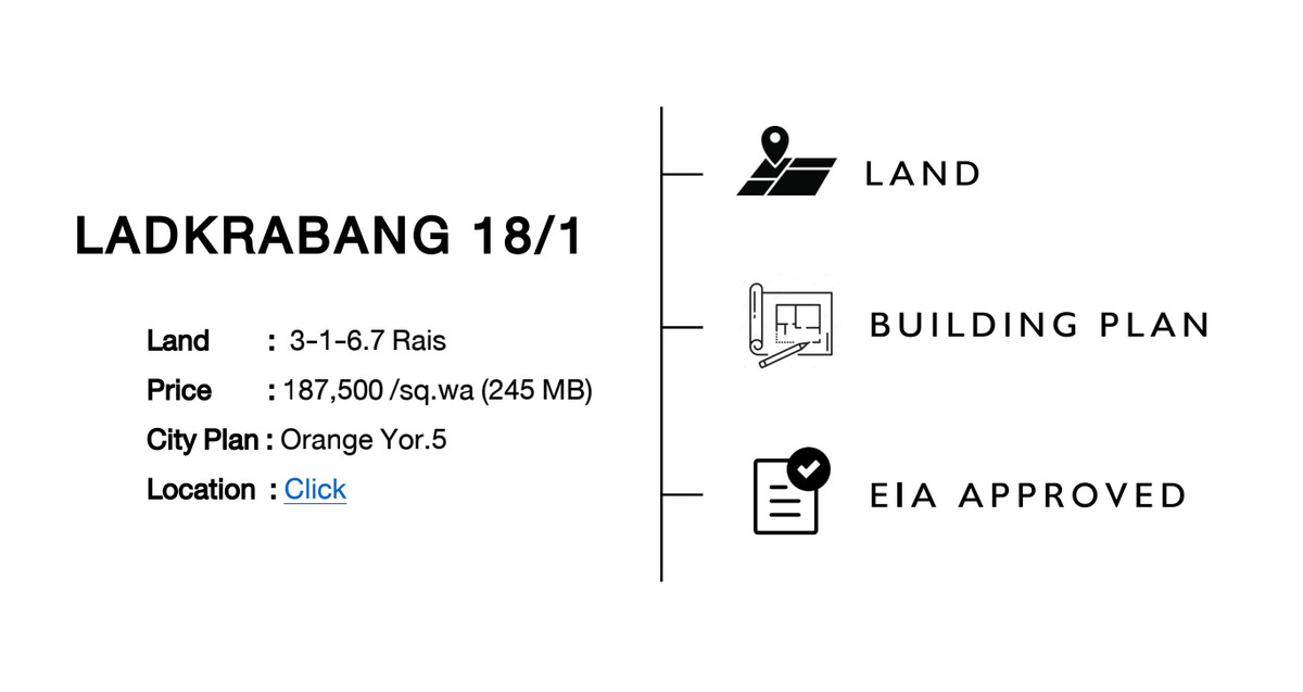 รายละเอียดที่ดิน: ขนาดที่ดิน: 3-1-6.7 ไร่ ㆍ ราคา: 187,500 บาท/ตารางวา (รวม 245 ล้านบาท) ㆍ ผังเมือง: สีส้ม ย.5 ㆍ สถานที่ตั้ง: ซอยลาดกระบัง 18/1 (ถนน ภาระจำยอม) ถนนลาดกระบัง แขวง ลาดกระบัง เขตลาดกระบัง กรุงเทพมหานคร ข้อมูลโครงการ THE ORIGIN SUVARNABHUMI: ㆍ ประเภทโครงการ: คอนโดมิเนียม Low- Rise, 2 อาคาร 8 ชั้น + คลับเฮาส์ ㆍจ จำนวนยูนิตทั้งหมด: 402 ยูนิต ㆍ พื้นที่จอดรถ: ประมาณ 35% ㆍ มูลค่าโครงการโดยประมาณ: 865 ล้าน บาท การอนุมัติ EIA: คณะกรรมการผู้ชำนาญ การฯ มีมติให้ความเห็นชอบรายงานการ ประเมินผลกระทบสิ่งแวดล้อม (EIA) เมื่อ วันที่ 26 ธันวาคม 2567 สถานที่ใกล้เคียง (ระยะทางโดยประมาณจาก SITE): ㆍ โรงพยาบาล: o โรงพยาบาลสิรินธร (SIRINDHORN HOSPITAL): 5.0 กม. ๐ โรงพยาบาลลาดกระบัง กรุงเทพมหานคร (LADKRABANG HOSPITAL) ㆍ ศูนย์การค้า: ㆍROBINSON LADKRABANG:6 6 นาที (2.4 กม.) ㆍHOMEPRO LADKRABANG: 4 นาที (1.4 กม.) ㆍMAKRO LADKRABANG:5 5 นาที (1.9 กม.) ㆍPASIO LADKRABANG: 6 นาที (2.0 กม.) o LITTLE WALK LADKRABANG: 4 นาที (1.7 กม.) สถานศึกษา/มหาวิทยาลัย: ㆍล ㅇ KMITL (สถาบันเทคโนโลยี พระจอมเกล้าเจ้าคุณทหารลาดกระบัง): 7.9 กม. ㆍ PROM SCHOOL:300 ม.