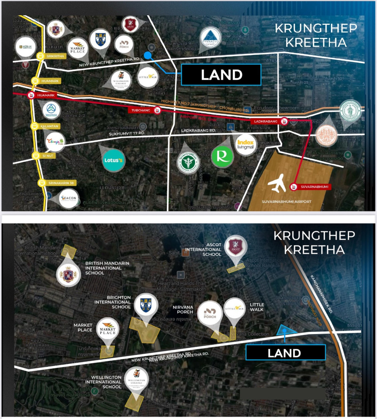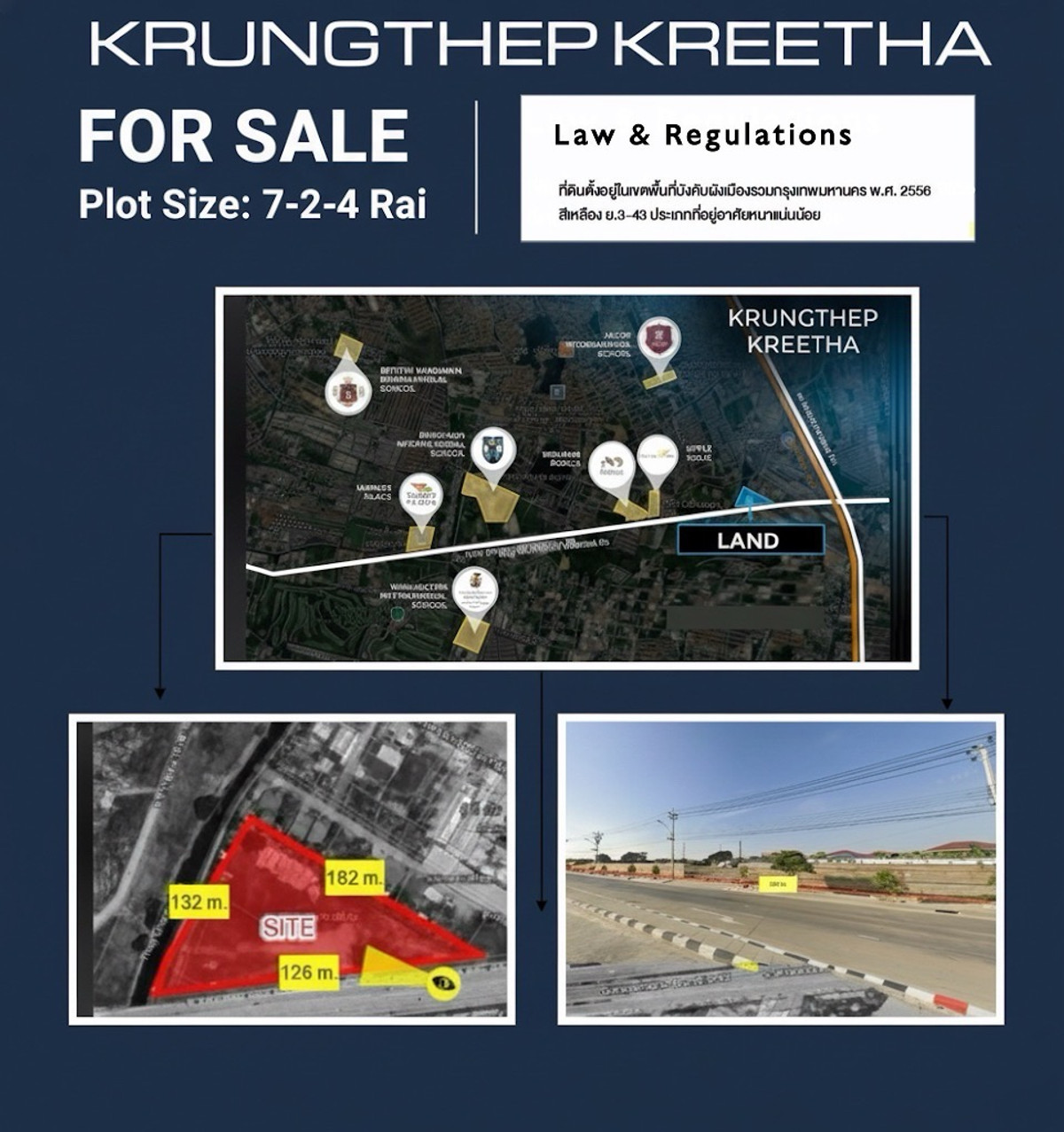 🏡 High potential land, Krungthep Kreetha - in the heart of the zone of luxury homes & international schools Land plot size 7-2-4 rai, yellow color Y.3-43 (low density housing) The front of the plot is approximately 182 meters wide, next to the main road, suitable for development • Luxury single house / villa project • International School / Learning Center • Sports Club / Wellness / Clinic Location "Krungthep Kreetha" is growing into a New Luxury Residential Belt surrounded by famous international schools, community malls. and many luxury housing projects convenient travel Connected to motorway, Si Rat Expressway, Suvarnabhumi Airport ✨ If you are looking for land for developing a premium project , this plot is one option that should not be missed. ———— Prime Land for Sale – Krungthep Kreetha • Plot size: 7-2-4 Rai • Zoning: Yellow – Yor 3-43 (Low Density Residential) • Approx. 182 m. road frontage Surrounded by leading international schools, luxury housing projects and lifestyle malls. Ideal for Luxury Housing Project, International School, Sport Club or Wellness Center. 📞 If interested, ask for details / make an appointment to view the land Contact: Sara Tel: Contact number Line ID: sarahqty