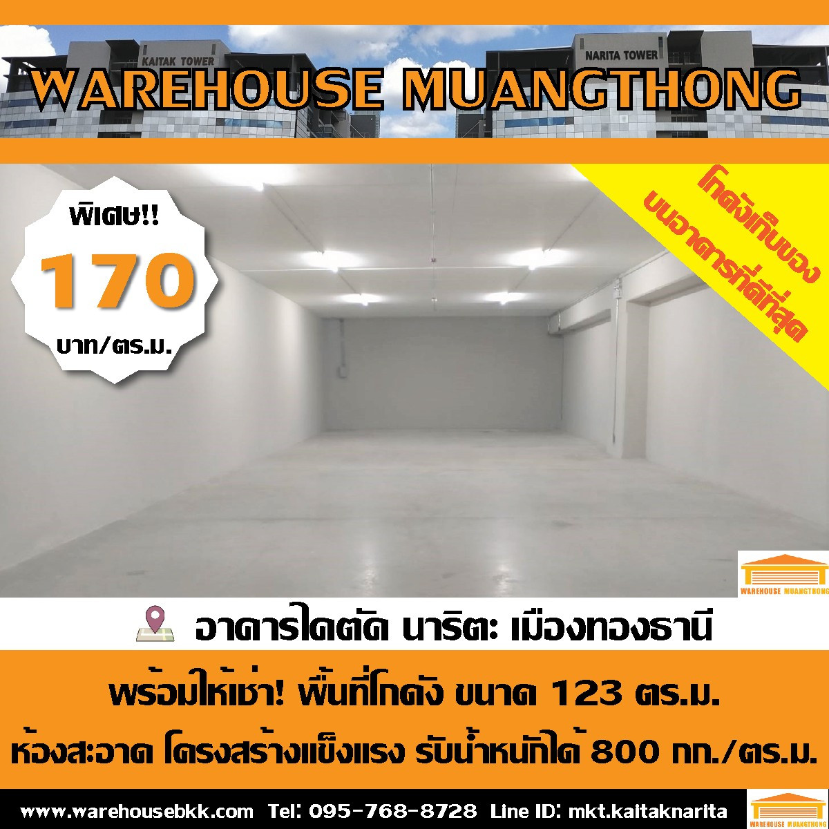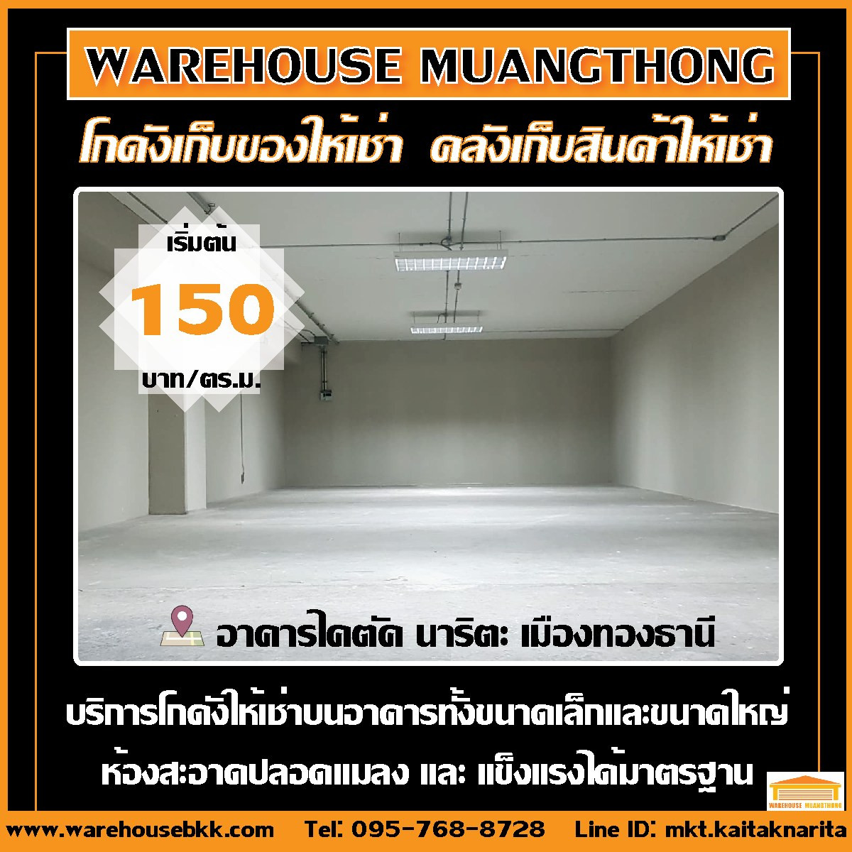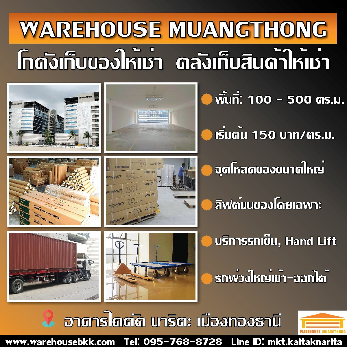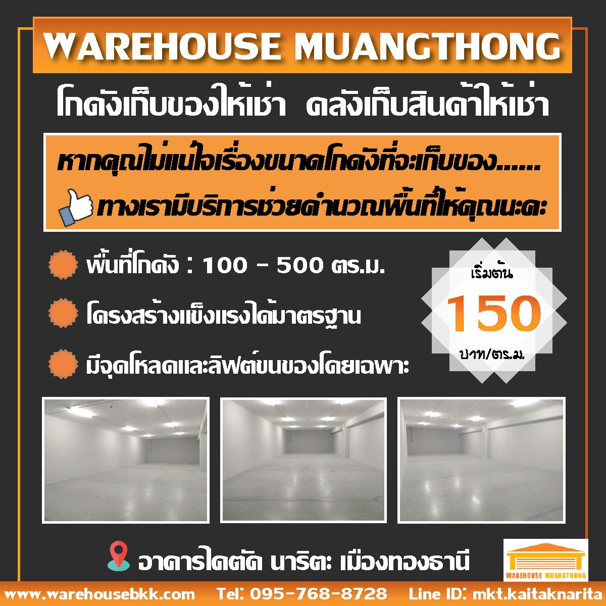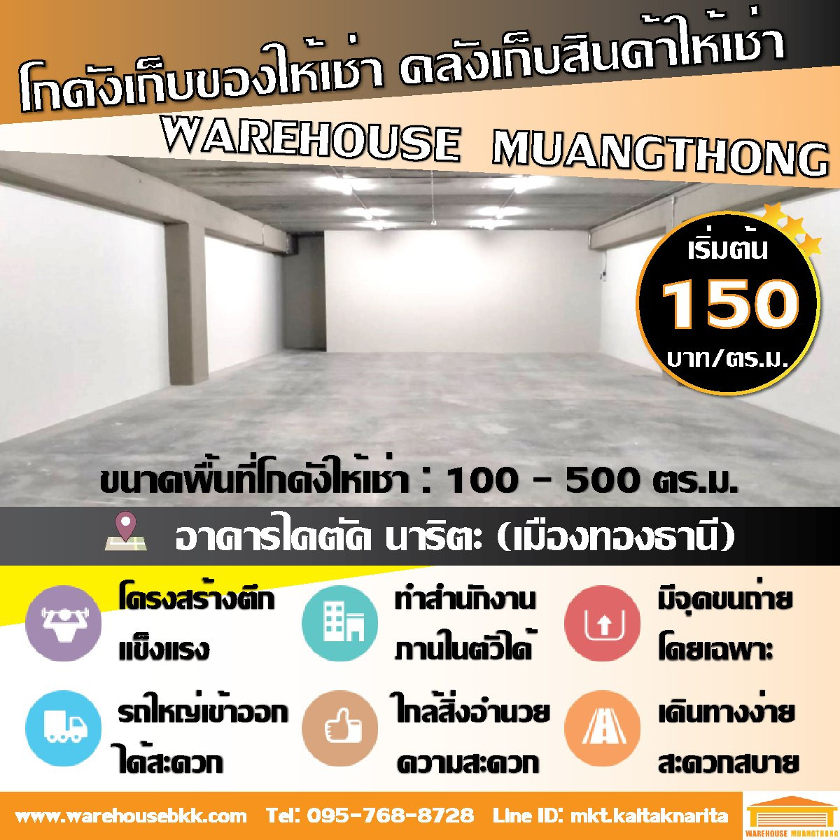 พื้นที่โกดัง : 100 – 500 ตร.ม. ราคาเริ่มต้น 150 บาท/ตร.ม. อาคารเปิดทุกวันตลอด 24 ชม. ขนาด 80 ตร.ม. – 500 ตร.ม. สามารถทำเป็นโกดังพร้อมสำนักงาน ขนส่งสินค้าสะดวก ใกล้จุดขึ้นลงทางด่วน เพียง 3 นาที หรือสาม