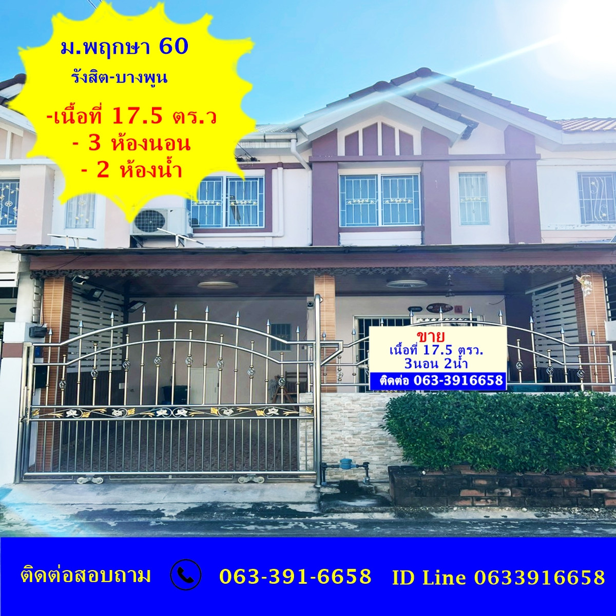 Townhouse for sale, 17.5 sq m, Pruksa Village 60, Rangsit-Bang Phun, good location, near Krung Siam St. Carlos Hospital, free loan arrangement.
