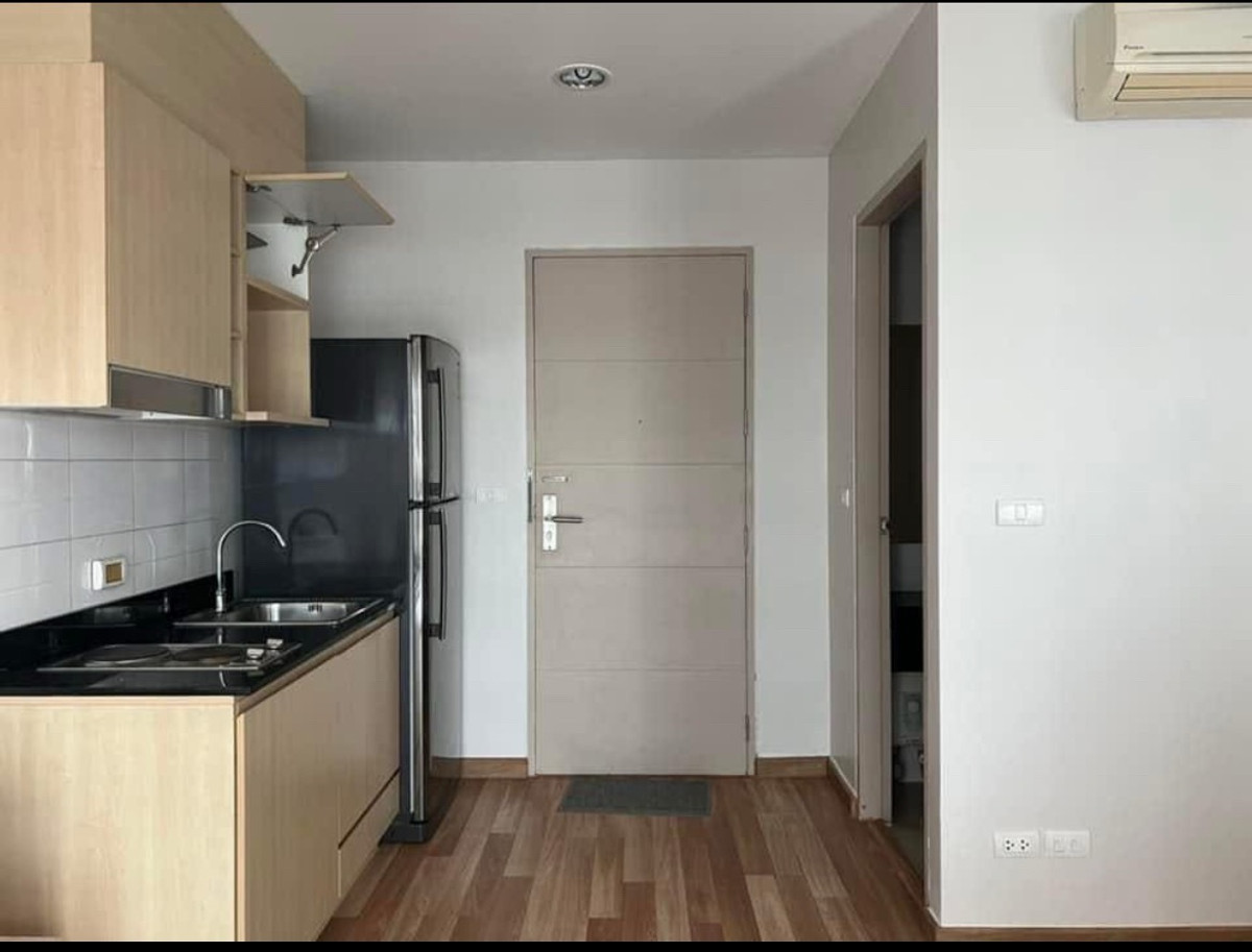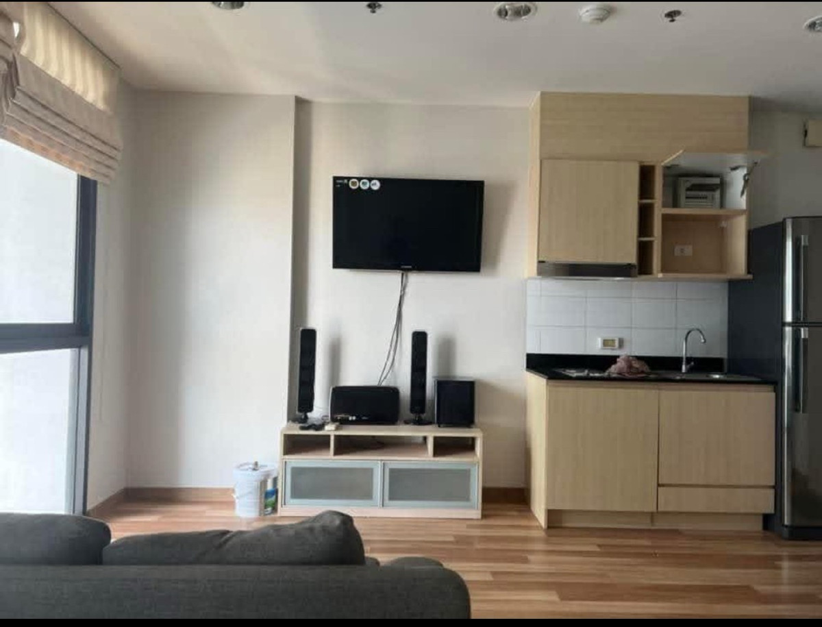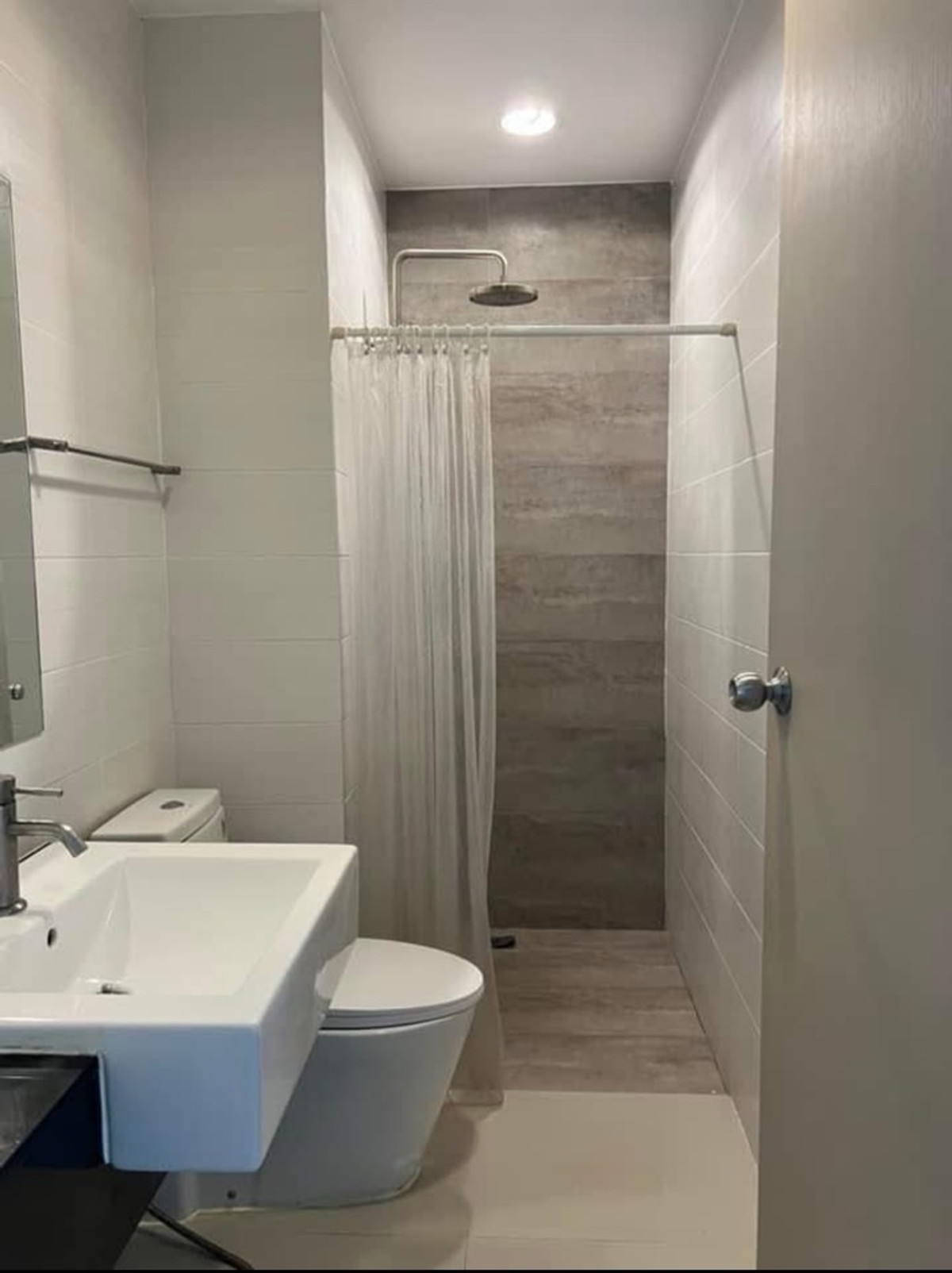 For rent IDEO Ratchada-Huai Khwang, next to MRT Huai Khwang, studio room, good corner, 26 sq m. 🏢 18th floor, highest floor 🏋️🏊‍♀️ Walk up to the fitness center. Swimming pool right away ✔️Minimum 1 year contract ✔️13,500 baht/month ✔️2 month warranty, 1 month rental in advance Furniture + electrical appliances in the room - TV - Refrigerator + electric stove - Bed with mattress - Wardrobe - Sofa - Water heater - Curtain separating shower area