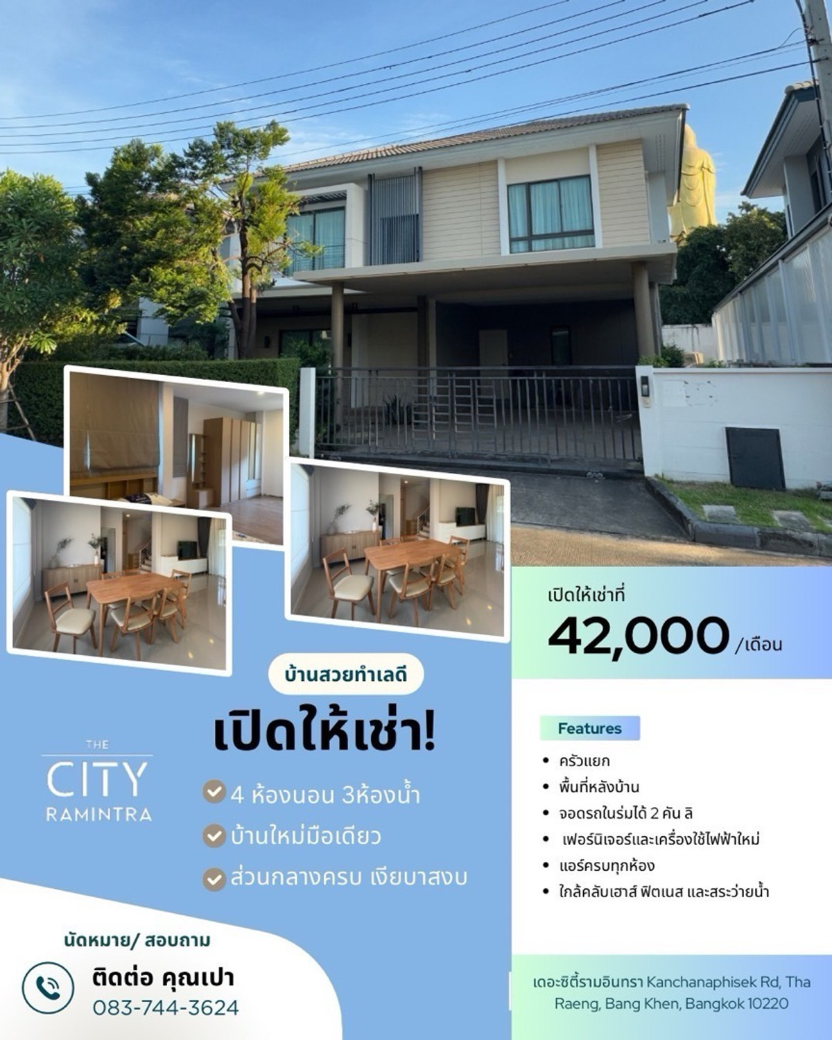The City Ramintra, beautiful house, quiet, fully furnished. Ready to move in immediately, area 77 sq m, usable area approximately 200 sq m , 4 bedrooms/d / 3 bathrooms 83 / 1 living room / 1 reception hall - separate kitchen, has space behind the house, indoor parking for 2 cars, li - all new furniture and appliances (2 sofa sets / 2 TVs / 2 beds / Clothes cabinet/dressing table/dining table set/air conditioning in every room Including the hall) The house is in a quiet inner zone, close to the clubhouse, fitness center and swimming pool The Citi Ramintra project is a mess. Convenient transportation, close to the expressway, BTS, and Central Ramintra # Rent: 42,000baht/month *Common fees included* 2 months insurance, 1 month in advance.