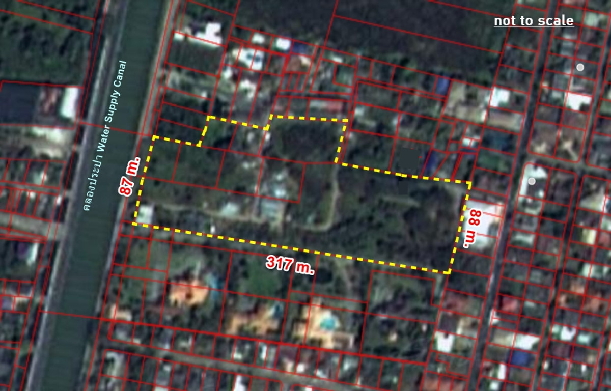 Land area: 18-2-68.3 rai (7,468.3 sqw.) Road frontage: 87 m. approx. Depth: 317 m. approx. Zoning: Medium Density Residential (Orange Yor.5) Condition: Filled land, road level Title Deed: 8 plots Loca