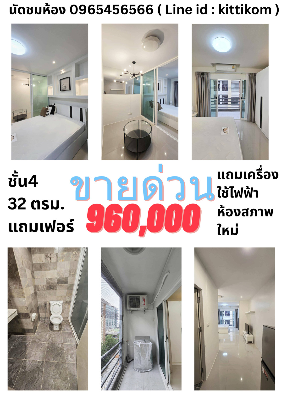 Urgent sale, only 960000 baht Transfer fee is half Free air conditioner / water heater / refrigerator / washing machine / microwave Bed / mattress / wardrobe Room size 32 sq m. / 4th floor / Building C Make an appointment to view the room at Line id : kittikom Tel. Contact number (Ton)