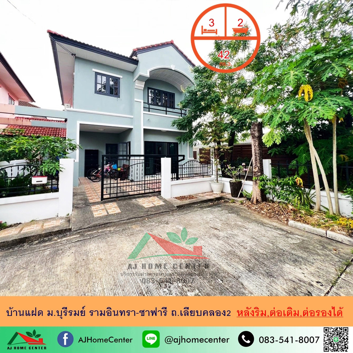 Semi-detached house for sale 42 sq m. Behind Buriram University, Ramindra-Safari, Liap Khlong 2 Road, beautiful and ready to move in . Twin house, 2 floors, 42 square wah, usable area 130 square meters 3 bedrooms, 2 bathrooms, 1 kitchen, 1 living room, 1 multi-purpose room. 1 parking space - Furniture up to negotiation - Adding a Thai kitchen behind the house + installing piles - Flooring materials: ground floor - granite / upstairs laminate - Front of the house facing north . Property location: Burirom Village, Ramintra-Safari (Soi Chomnad 3), Soi Wat Khubon, Liap Khlong 2 Road, Sam Wa West Subdistrict. Khlong Sam Wa District, Bangkok Google coordinates: https://maps.app.goo.gl/VfiNHiHCCF6WwaL79 The journey starts from the road along Khlong Song, in front of the entrance of the alley, along Khlong Song 11 > Turn left into Panya Indra Road > Baan Burirom Ramintra-Safari *The project is in progress. Soi along Khlong Song 21-25 . Selling price 3.59 million baht . Highlights - Semi-detached house, detached house style, corner house with space on the side - Bellva-Carisa house style Usable area 130 sq m. - Strong house structure. The house is ready to move in - inside the project is shady. Close to nature with a large recreational park - The entrance to the project is next to the road along Khlong Song. Convenient travel - near markets, shops, restaurants, hospitals, department stores. and government agencies - Price negotiable - Free loan arrangement service by professionals - Direct installment service available . Facilities in the project – Clubhouse – swimming pool - Park – Fitness – 24 hour security system . Nearby places > Fashion Iceland > Central Ramindra > Big C along Khlong 2 > Sarasas Witaed Nimitmai School > Khubon Market > Khubon Temple > Synphaet Hospital > Paolo Nawamin Hospital > Nopparat Ratchathani Hospital > Safari World Zoo . If interested, contact Mr. Bank, phone number Contact number / Contact number / Contact number