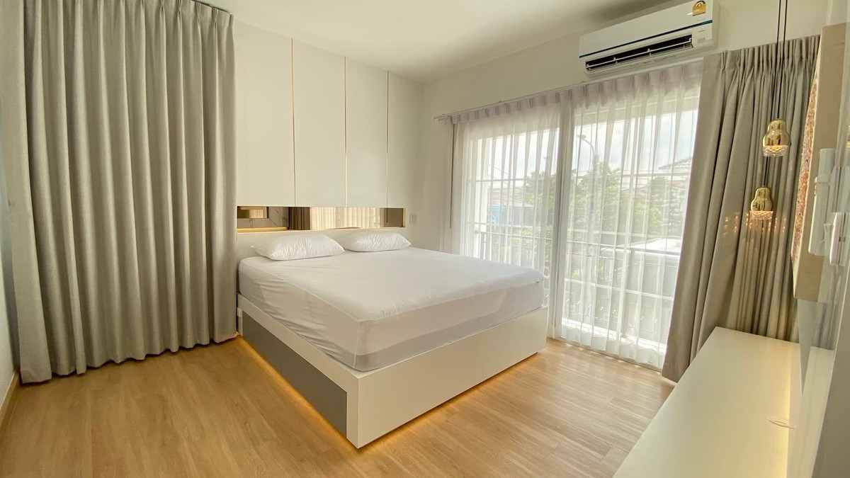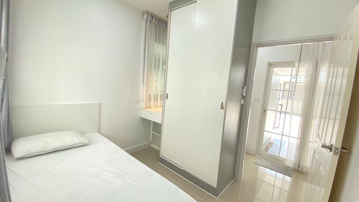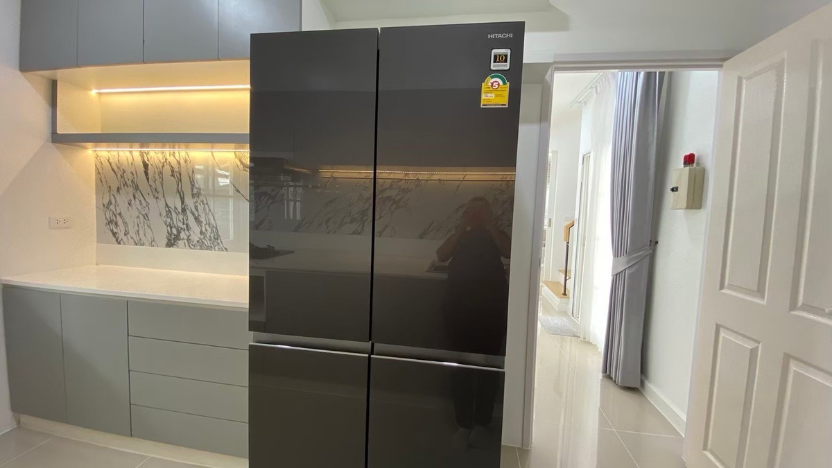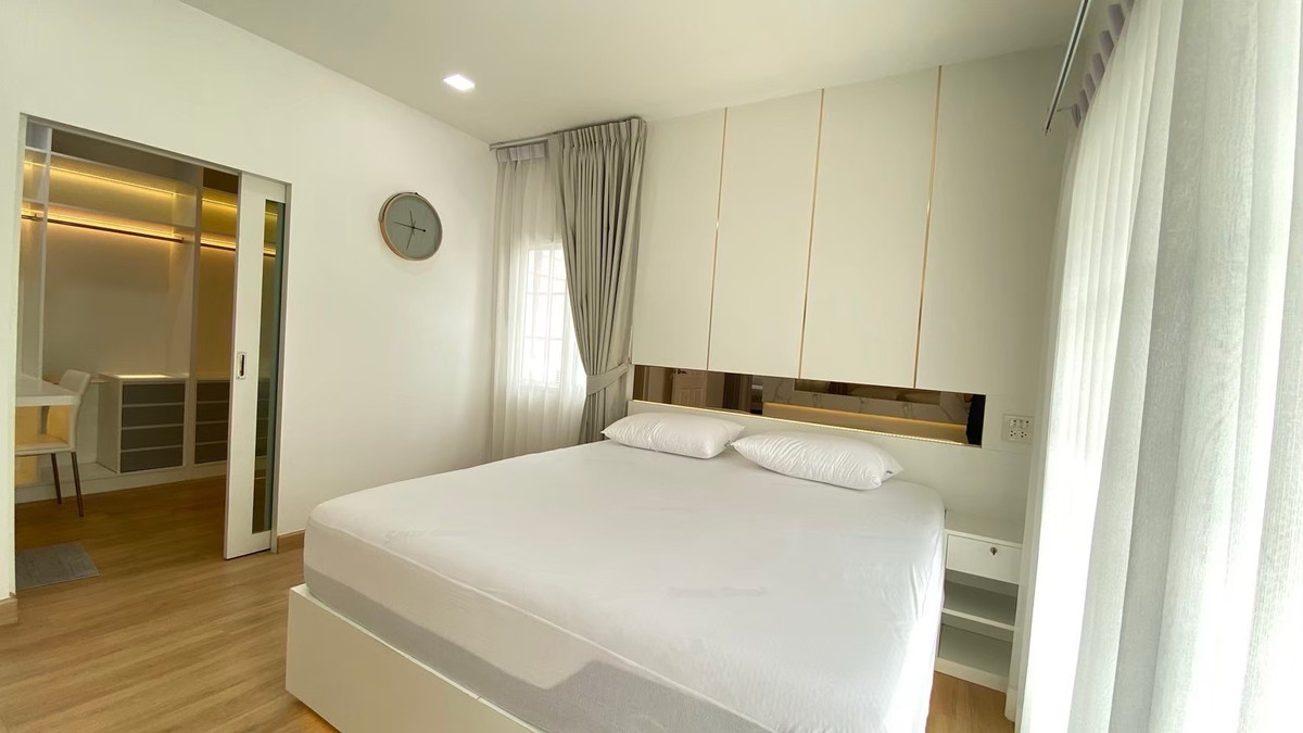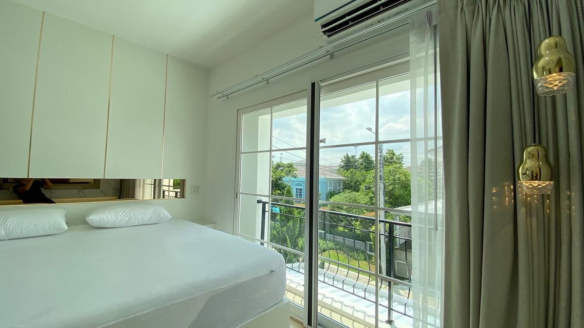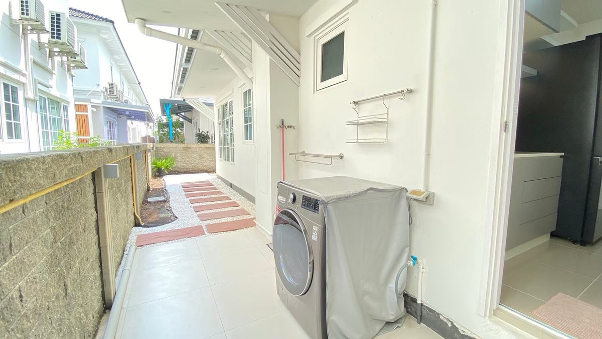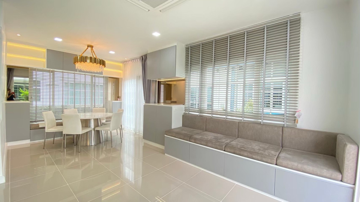 House, usable area 140 sq m, 4 bedrooms, 3 bathrooms, hall, kitchen: Golden Neo Village, Sukhumvit, Lasalle The whole house is decorated with built-ins, ready to move in Living room - TV - Built-in furniture with lights: TV shelf, sofa, lamp, drawers and storage cabinets, etc. -Dining table with chandelier - Curtains + blinds + pleated mosquito net - 4-way air conditioner Kitchen + washing area -Built-in kitchen counter Complete with lights and storage cabinets - Water filter - Hood + stove - Water tank with pump -Washing machine-dryer-4-door refrigerator -Bedroom blinds + pleated mosquito netting -Washer and dryer Bedroom 1 (1st floor) -Bed 3.5 feet + mattress - Built-in furniture: wardrobe + table -Curtains -Air conditioner Bedroom 2 (2nd floor, master) -6 foot bed + mattress - Built-in furniture: TV shelf, bedside table -WALK IN CLOSET, built-in with lights and glass door separating the room -Air conditioner Bedroom 3 (2nd floor) -Bed + 5 foot mattress -Built-in furniture: wardrobe + table + dressing shelf + large mirror -Curtains-Air conditioner Bedroom 4 (2nd floor) -Curtains -Air conditioner Common area -Swimming pool -fitness-garden and playground -lawn and lake 2 electric train lines in one alley transportation routes Sukhumvit Road, Srinakarin Road , Bearing Road (Sukhumvit 107) , Chalerm Mahanakorn Expressway , Kanchanaphisek Expressway Burapha Withi Expressway, BTS Samrong , Yellow Line , beautiful house for rent, livable, good condition, new house There are many ways to enter and exit, easy to find things to eat.