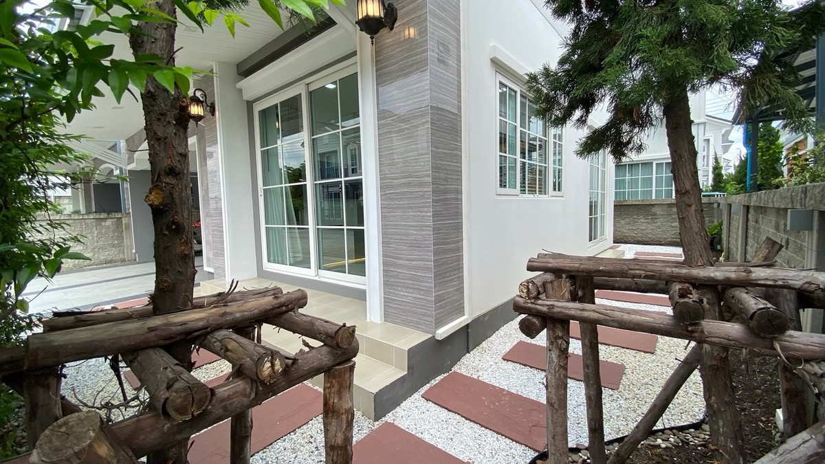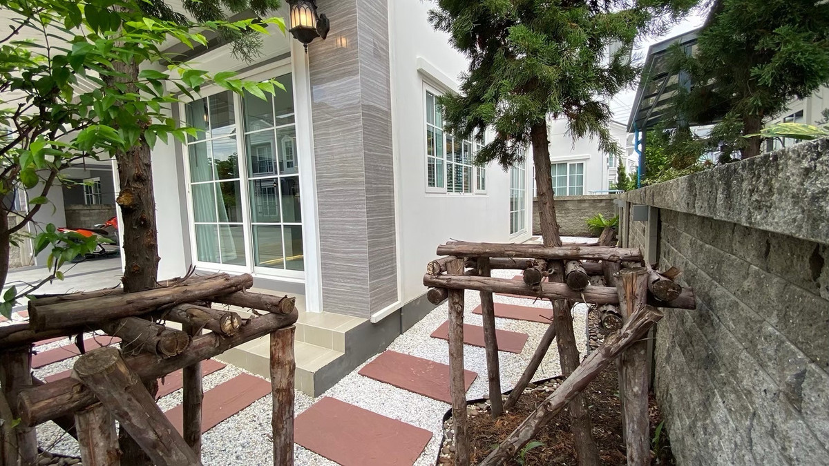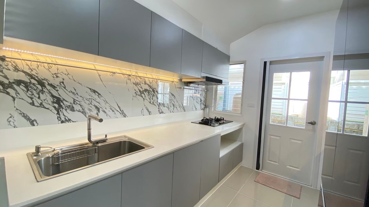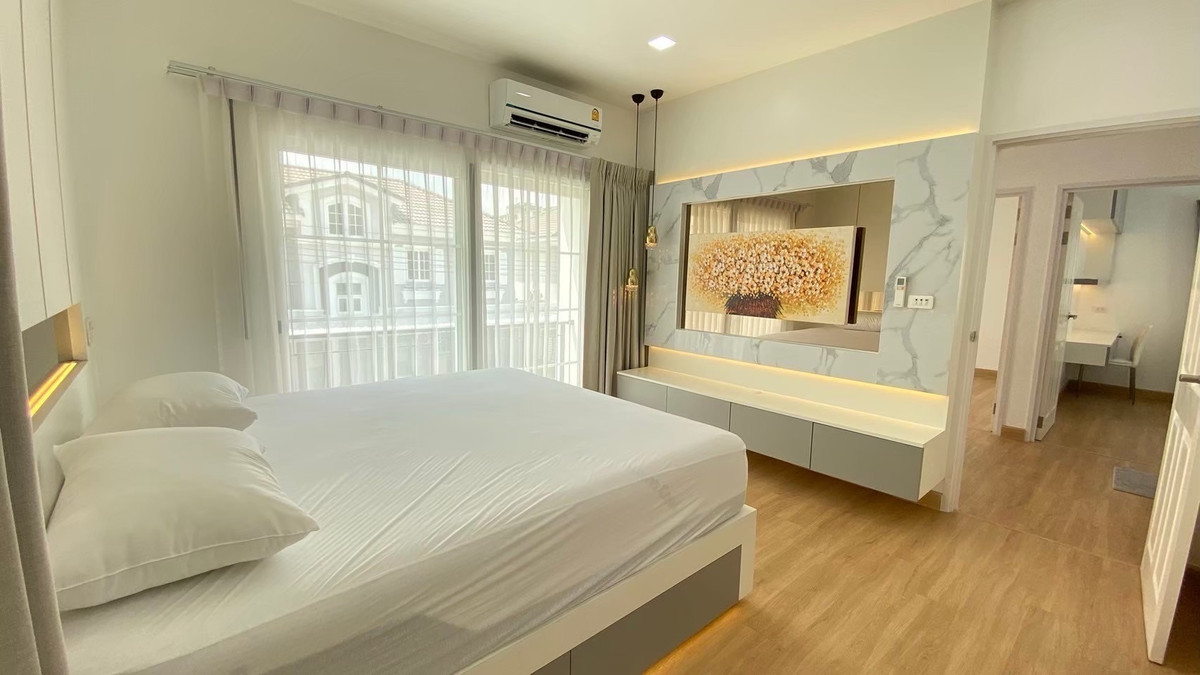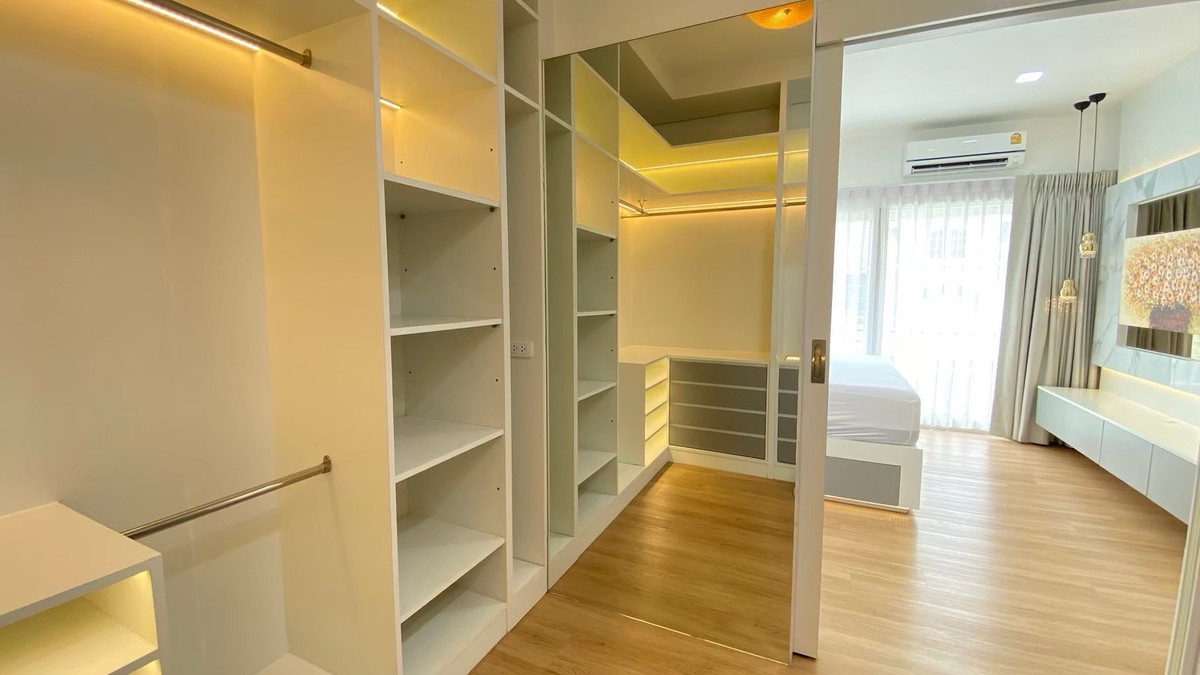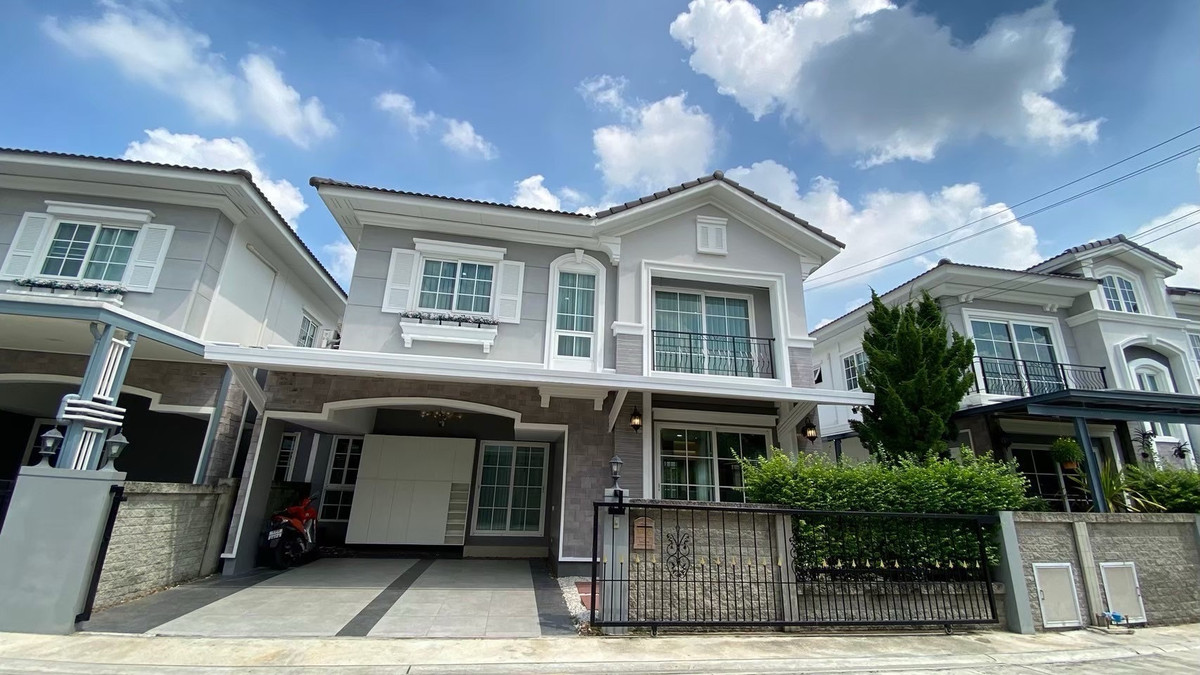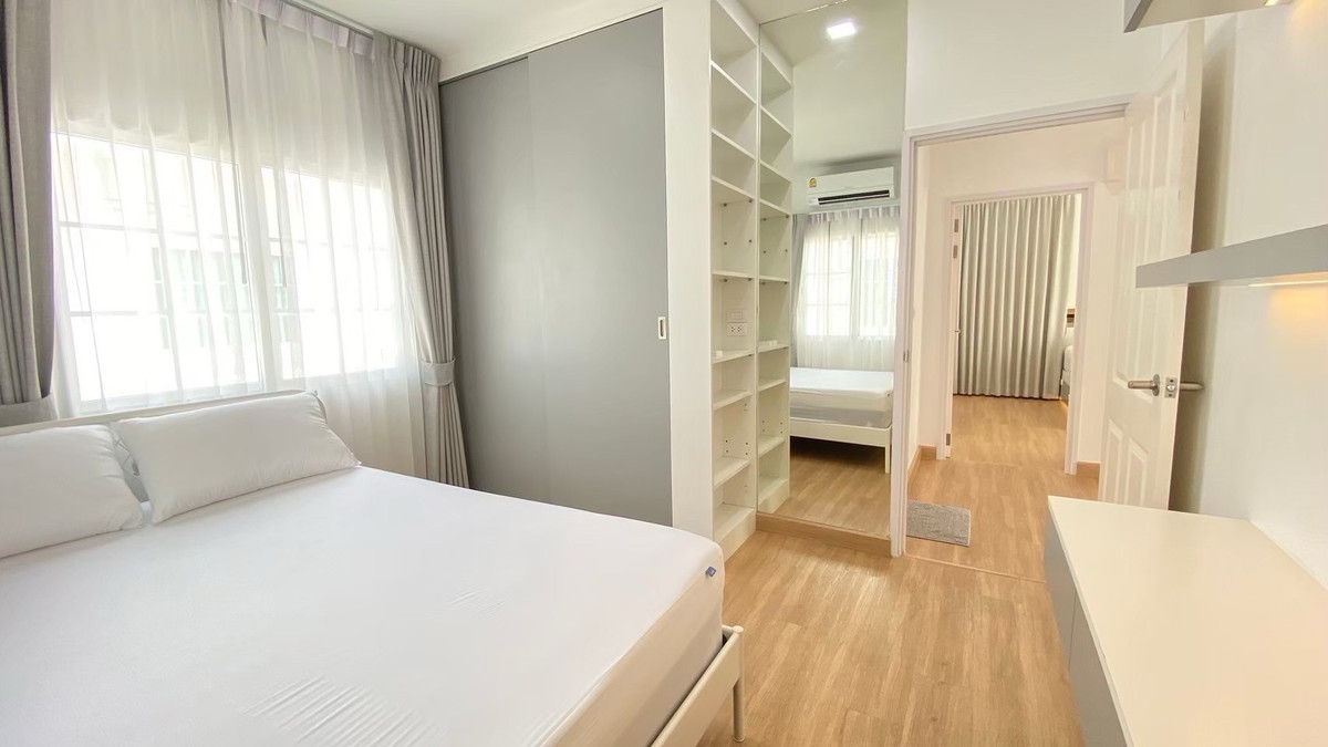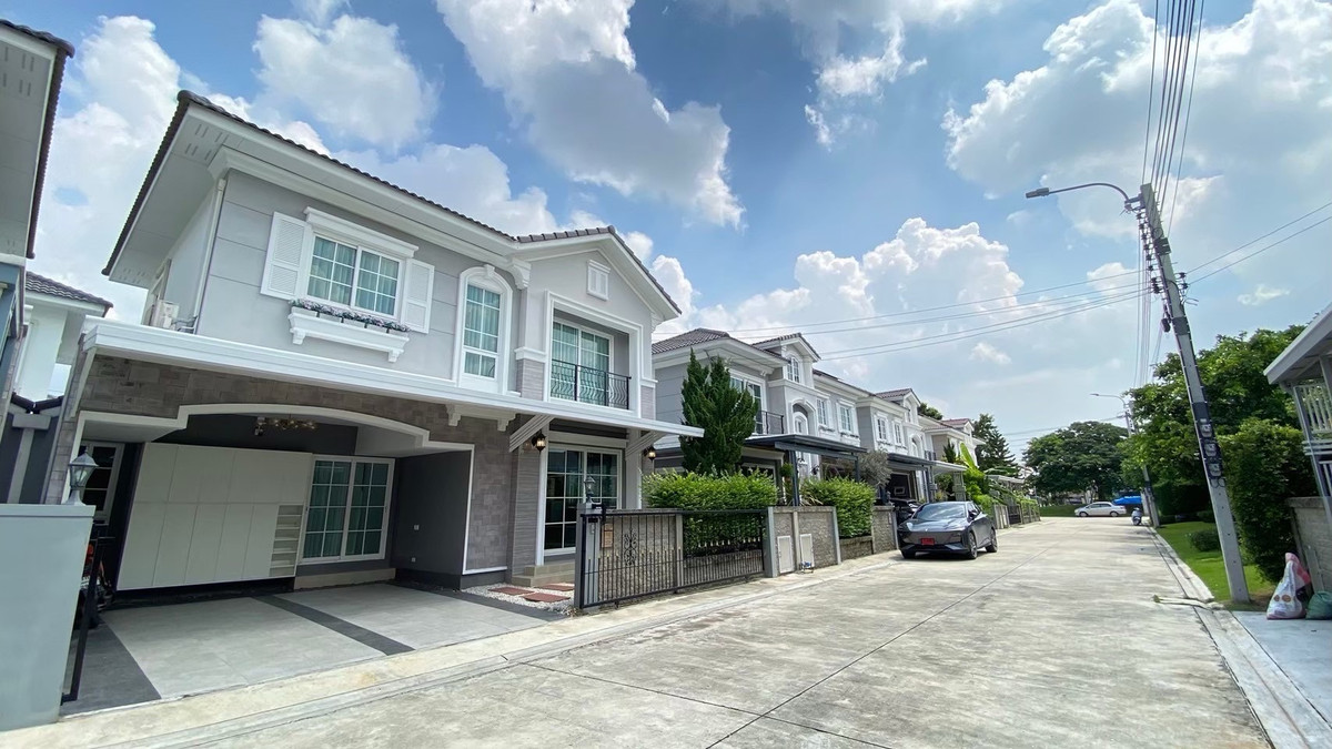 House, usable area 140 sq m, 4 bedrooms, 3 bathrooms, hall, kitchen: Golden Neo Village, Sukhumvit, Lasalle The whole house is decorated with built-ins, ready to move in Living room - TV - Built-in furniture with lights: TV shelf, sofa, lamp, drawers and storage cabinets, etc. -Dining table with chandelier - Curtains + blinds + pleated mosquito net - 4-way air conditioner Kitchen + washing area -Built-in kitchen counter Complete with lights and storage cabinets - Water filter - Hood + stove - Water tank with pump -Washing machine-dryer-4-door refrigerator -Bedroom blinds + pleated mosquito netting -Washer and dryer Bedroom 1 (1st floor) -Bed 3.5 feet + mattress - Built-in furniture: wardrobe + table -Curtains -Air conditioner Bedroom 2 (2nd floor, master) -6 foot bed + mattress - Built-in furniture: TV shelf, bedside table -WALK IN CLOSET, built-in with lights and glass door separating the room -Air conditioner Bedroom 3 (2nd floor) -Bed + 5 foot mattress -Built-in furniture: wardrobe + table + dressing shelf + large mirror -Curtains-Air conditioner Bedroom 4 (2nd floor) -Curtains -Air conditioner Common area -Swimming pool -fitness-garden and playground -lawn and lake 2 electric train lines in one alley transportation routes Sukhumvit Road, Srinakarin Road , Bearing Road (Sukhumvit 107) , Chalerm Mahanakorn Expressway , Kanchanaphisek Expressway Burapha Withi Expressway, BTS Samrong , Yellow Line , beautiful house for rent, livable, good condition, new house There are many ways to enter and exit, easy to find things to eat.