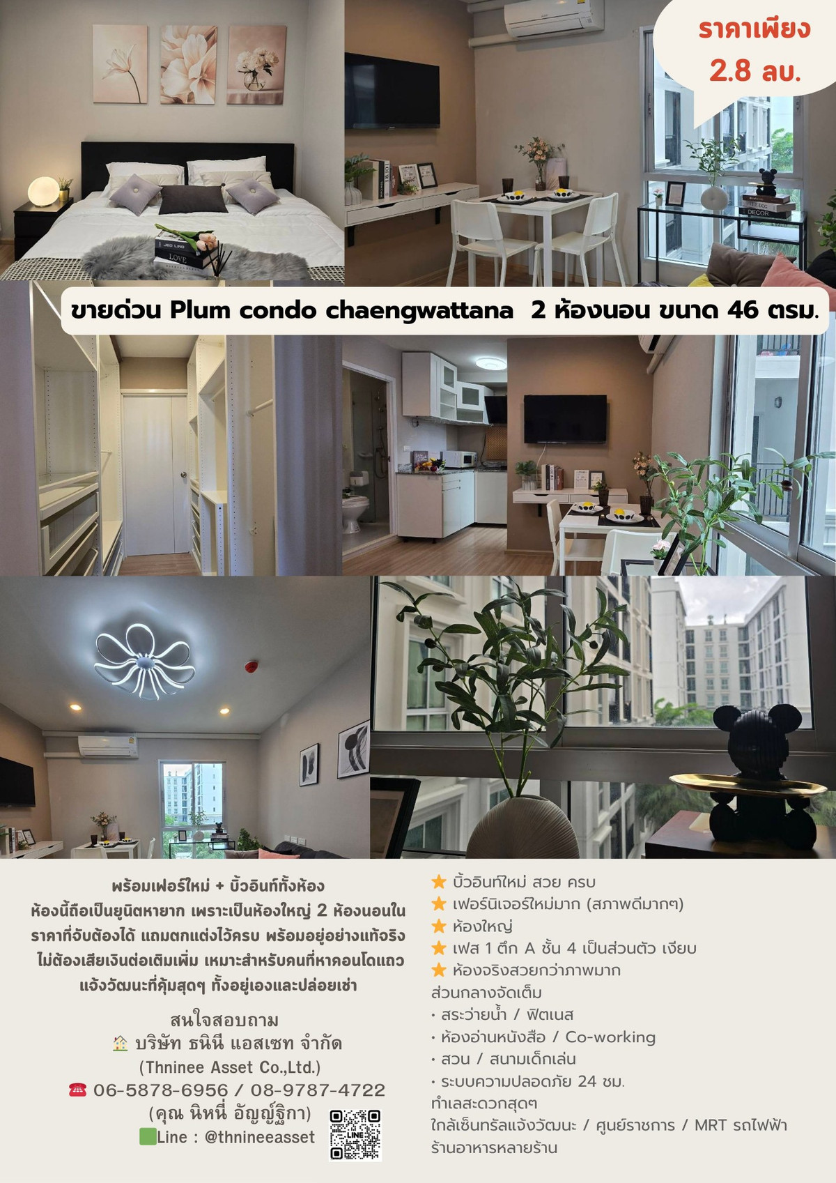 🔥 Urgent sale! Very good price, Plum Chaengwattana Condo Phase 1, Building A, 4th floor, 2 bedrooms, 46 sq m 💥 Price only 2.8 million baht with new furniture + built-in throughout the room This room is considered a rare unit. Because it is a large room with 2 bedrooms at an affordable price. Plus its fully decorated. Truly ready to live in No need to spend additional money. Suitable for people who are looking for a condo in the Chaengwattana area that is a great value. Both live in and rent out The most important feature of this room ⭐ New built-in, beautiful, complete ⭐ Very new furniture. (Very good condition) ⭐ Big room ⭐ 4th floor, private, quiet ⭐ The actual room is much more beautiful than the picture Full common area • Swimming pool / fitness • Reading room / Co-working • Garden / playground • 24 hour security system Very convenient location near Central Chaengwattana / Government Center / MRT Skytrain / many restaurants 💥 Make an appointment to see the actual room. Very beautiful. You definitely wont be disappointed :: If interested, inquire :: 🏠 Thaninee Asset Co.,Ltd.) ☎️ Contact number / Contact number (Khun Ninee Anthika) 🟩Line : @thnineeasset 👇Click here You can get it👇 http://bit.ly/3PPOFBL 📌Office of Thanini Asset Co., Ltd. Shop Plum Condo Mix Chaengwattana Shop Phase 4, Building B, 1st Floor 🔥Sell, rent, buy. Let us help. Good service. There is a store front to coordinate 24 hours.🔥 #Accept real estate for sale, rent, rent. #Buy, sell, rent condos, houses, land. #Condo Chaengwattana Laksi #Condo along the electric train line #CondoNonthaburiNgamwongwan #Condo near Kasetsart #Condo near Sripatum #Condo near Chaengwattana Government Center #Plum Condo Mix Chaengwattana for sale