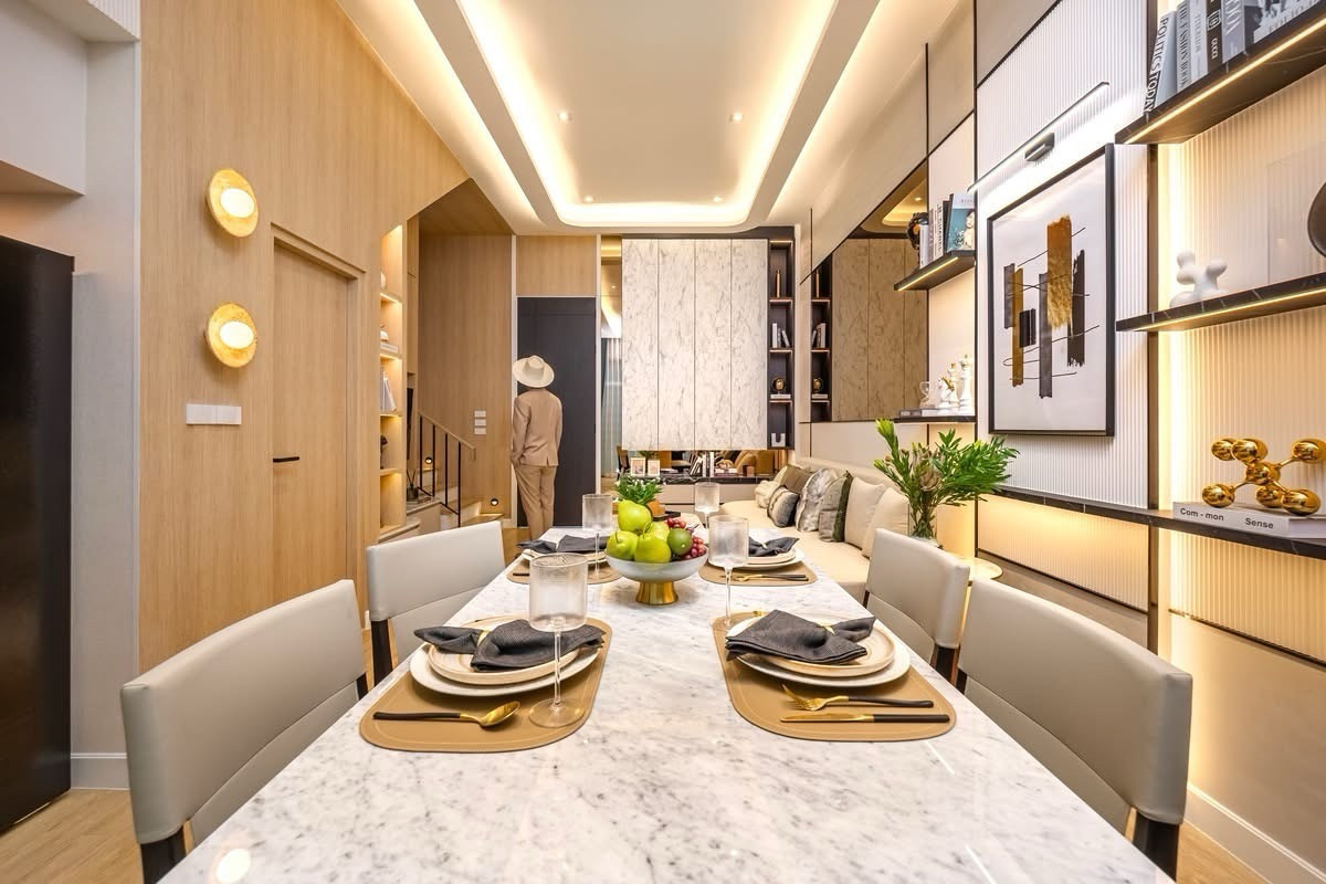 Introducing The Forest Ratchada project, an exclusive collection of premium townhomes spanning 3 and 3.5 storeys. Nestled on a sprawling 4-0-81 rai expanse, each of the 39 units enjoys a meticulously designed space within the 18.8-55.2 sq m house area. With a practical usable area ranging from 166-266 sq.m., these homes offer 3 bedrooms, 4-5 bathrooms, a dedicated maids room, and ample parking for two vehicles. Moreover, the provision for Lift Installation, Lift Parking, Swimming Pool, and Rooftop spaces add an extra layer of convenience. The project embodies a visionary design concept that amalgamates two central ideas, catering to the distinct needs of residents while championing sustainability in all aspects of living. Embracing the MIND-SPACE aspect, the design prioritizes open, unoccupied spaces. These spaces invite you to infuse each moment with personal significance, encouraging an authentic self-expression. Bolstered by innovative GREENRY SPHERE technology, the environment boasts a continuous cycle of clean, rejuvenating air, ensuring a hygienic living atmosphere. Advanced hygienic home features and other contemporary technologies enhance the sustainability of everyday life. The community comes complete with a well-equipped clubhouse and communal zones, including the airy Green Pavilion enveloped in panoramic glass windows and embraced by towering trees. This space is ideal for embracing natural light and fresh air. Residents can unwind at the Relax Pool, Kid Pool, Jacuzzi, and Forest Yard, fostering long-term community engagement. The presence of a vigilant CCTV and a 24-hour security system ensures your peace of mind.