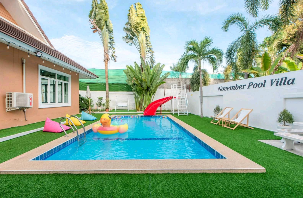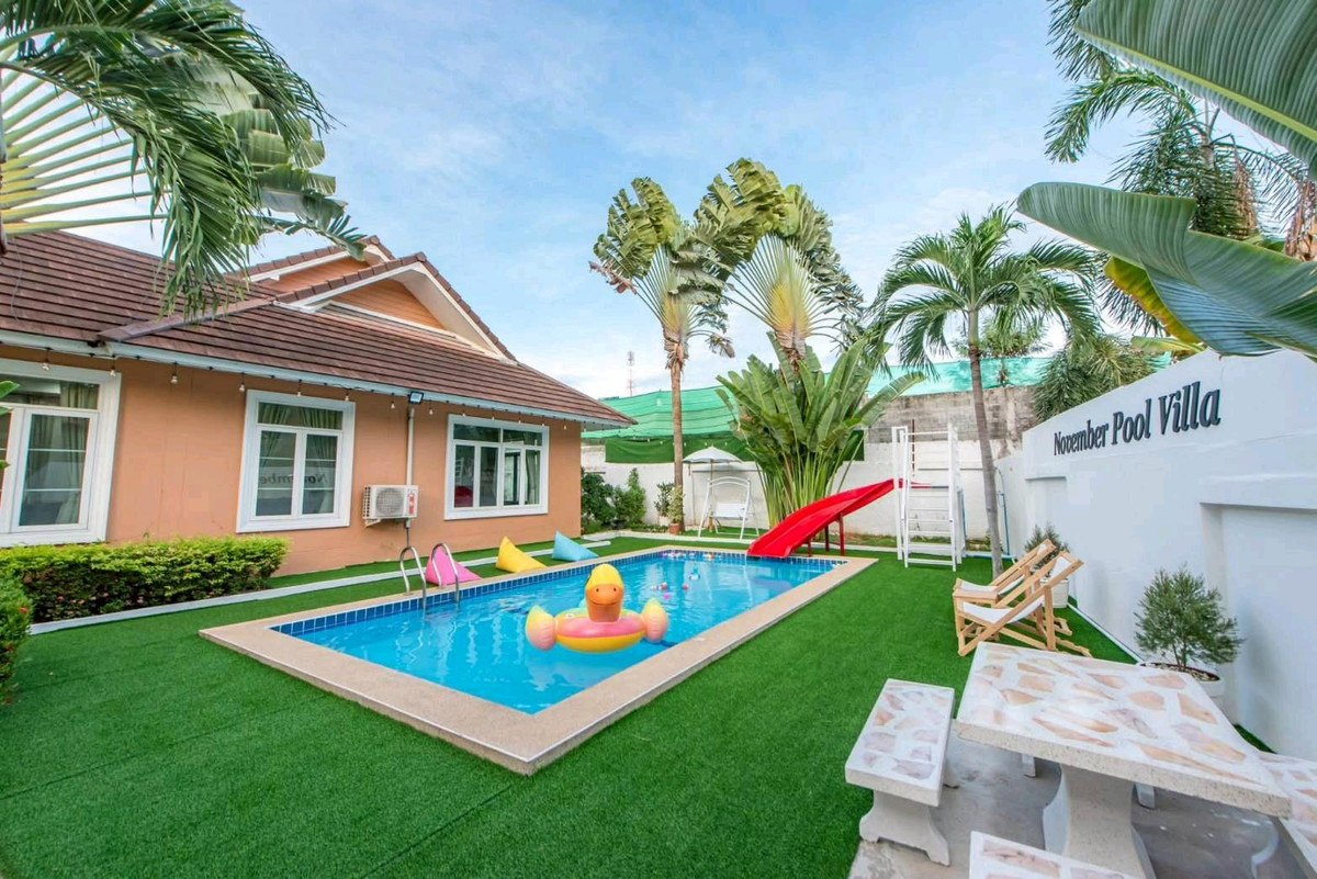 Pool villa for rent 45,000/mo annually. ✔️ Can do business 📍Nong Ket Yai, near Regent 5 minutes. ▪️3 bedrooms, 3 bathrooms ▪️ Private pool with slide ▪️1 living room ▪️ 1 kitchen ▪️ 5 beds ▪️ Sofa ▪️