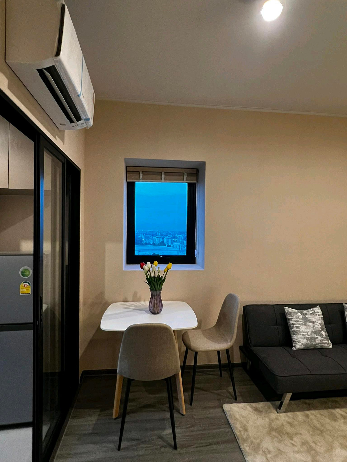 !!1 Bedroom with bathroom in the bedroom, 1 Living room & kitchen!! 18th floor | 33.77 sq m. Corner room, very beautiful view. Furniture - complete electrical appliances Near the Yellow Line Lam Sali Intersection Station, just a 3-minute walk. Near The Mall Bang Khae Grip's new room has just been decorated. Rental price: 15,000 baht/month (minimum 1 year contract) Price negotiable. Room details • 18th floor, corner room • Size 33.77 sq m. • 1 bedroom, 1 bathroom • 1 living room • Kitchen + balcony • Complete furniture and electrical appliances. Ready to move in immediately. • 1 TV, 2 air conditioners, 2 electric stoves with range hood, 1 refrigerator, water heater. washing machine • Bed, wardrobe, TV shelf, sofa, dining table + 2 chairs, shelves. Project next to 7-11, The Mall Bang Khae Department Store, BTS Skytrain. Pets are not allowed. And smoking is not allowed inside the room.