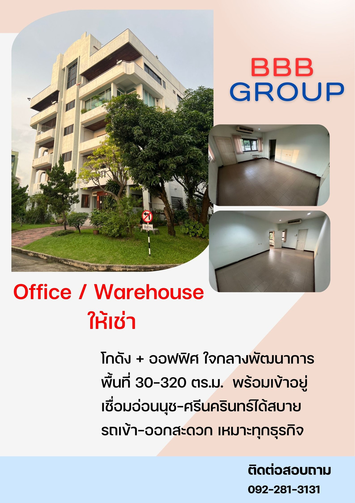 โกดัง/ออฟฟิศ ใจกลางพัฒนาการ พื้นที่ 30-320ตร.ม. มีซอยเชื่อมอ่อนนุช-ศรีนครินทร์ได้สบายไม่เกิน 5นาที รถเข้า-ออกสะดวก เหมาะทุกธุรกิจ ติดต่อสอบถาม เบอร์ Contact number
