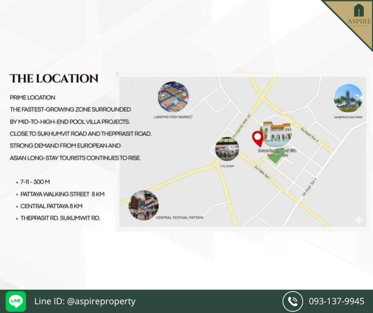 [For Sale] Brand New, Pool Villa, Mediterranean-Style, Pattaya Property Code: TP25017233 • Land size 139 sq.wah • Usable area 550 sq.m. • 5 BR, 7 BA • Private swimming pool • Private garden • Party and event area • Fully equipped & furnished Selling Price 19.9 MB (Transfer fees 50/50) For viewing, contact Tel. : Contact number WhatsApp : Contact number Line ID : @aspireproperty Email : Contact email Aspirethailand.com