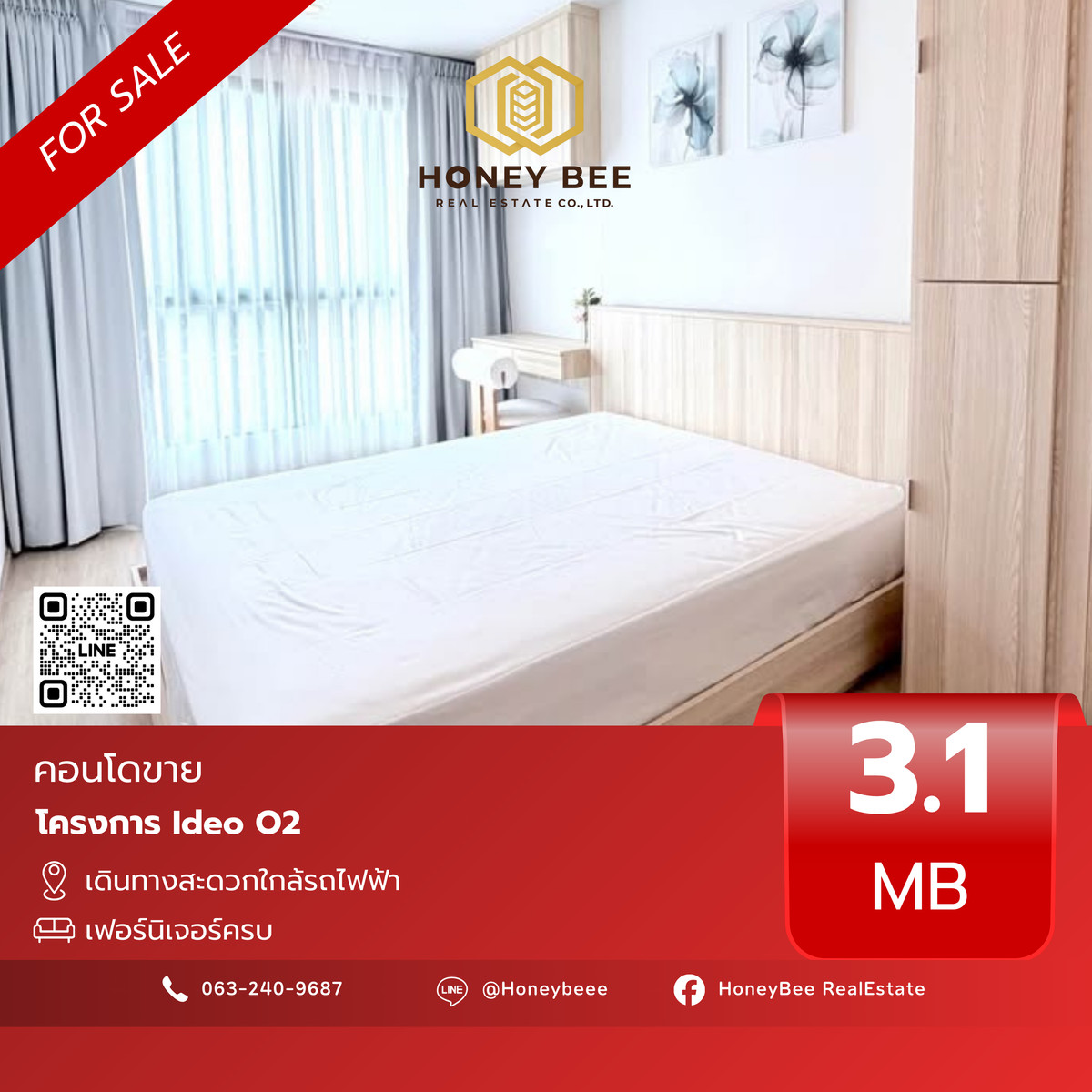 ❗️Ideo O2, fully furnished, very good condition, beautiful room 🔥 📍Code BH03 ✨Selling for only 3.1 million baht ☀️Details - Size 33 sq m. - 17th floor - 1 bedroom - 1 bathroom 📲 Interested in making an appointment to view the condo 😊 Contact admin 📞 : Contact number 👉🏻 Line link: https://page.line.me/Honeybeee ❇️ Line id : @Honeybeee (has 3 e's) 🐝 Honey Bee Real Estate 🍯