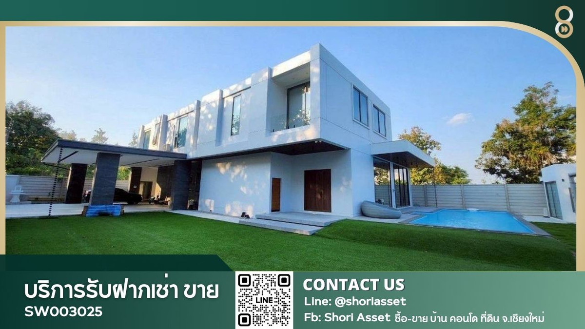 SW003025 Modern pool villa for sale, 2 stories, on land size 1 rai, spacious usable area. Fully decorated with built-in furniture and electrical appliances. New San Kamphaeng location Convenient travel into the city Location: San Kamphaeng Mai Road, Plus Kang Land size: 1 rai, usable area: 700 square meters House size: 2 floors House type: 7 bedrooms, 8 bathrooms Parking space: 6 cars Selling price 29,000,000 million baht *There are single houses and condos available for rent and sale. If interested, please contact -------------------------------------------------------------------------