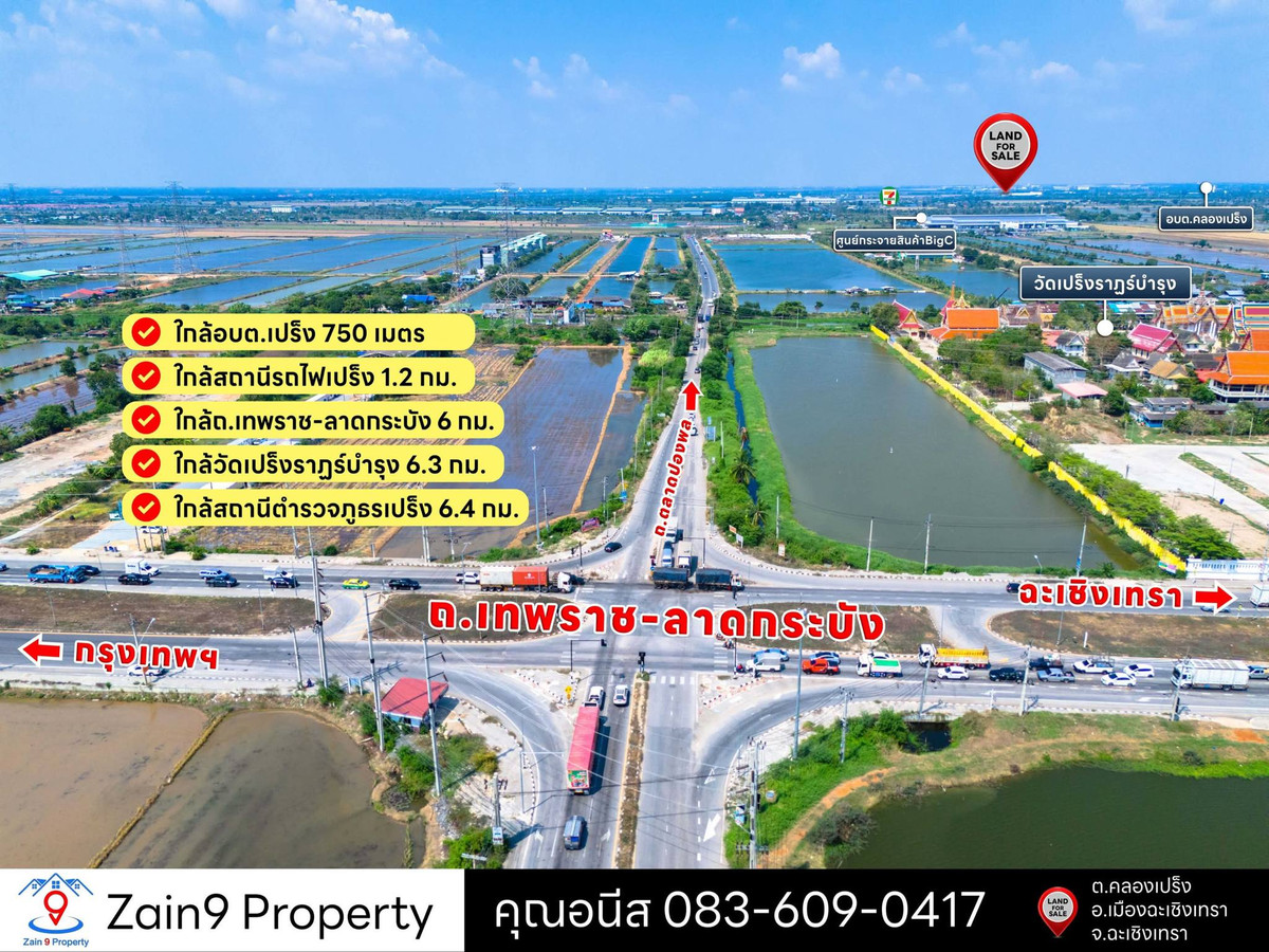 Land for sale in Khlong Preng, Chachoengsao Province, beautiful plot, next to the road on 2 sides.